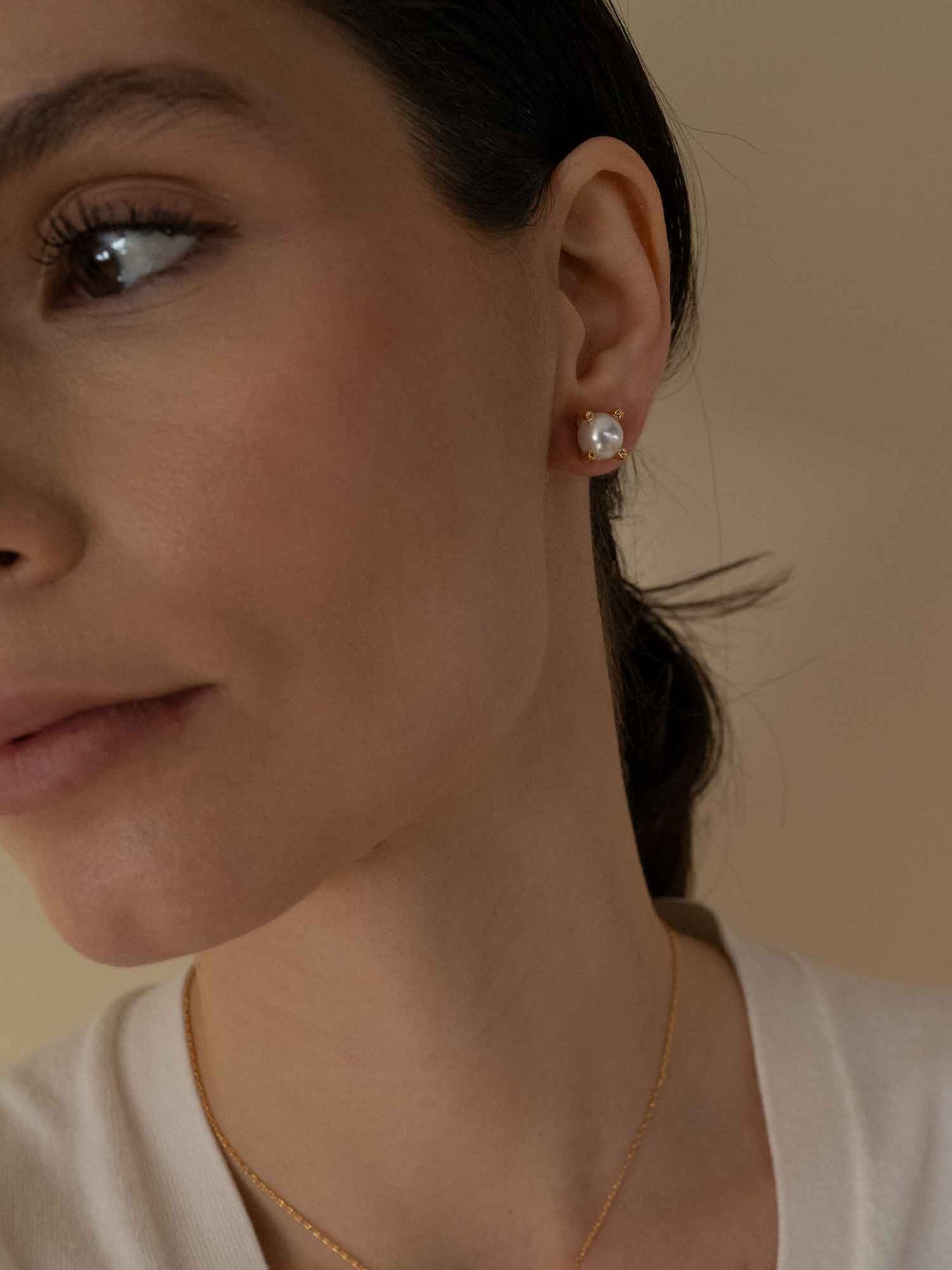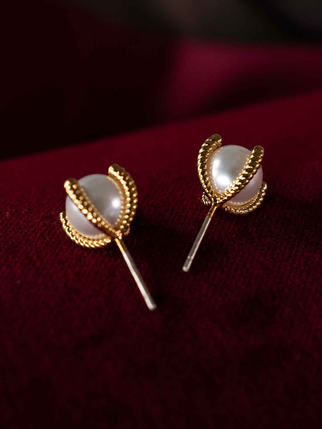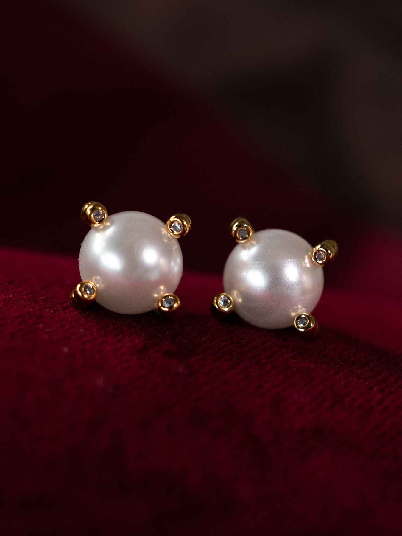 These stud earrings feature a smooth pearl set in a gold base—one style with four delicate prongs, each tipped with a tiny zircon for subtle sparkle, the other with a braided rope edge for added texture. Both designs keep the pearl as the focal point while the gold adds understated contrast and structure.