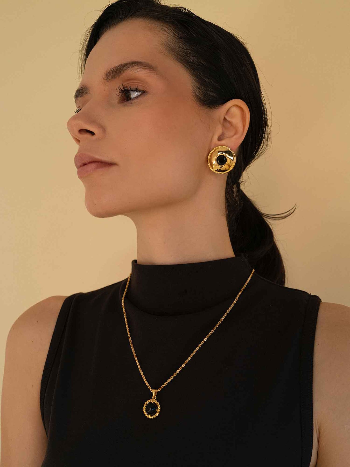 A gently domed gold disc catches the light in soft waves, while the inky center stone anchors the shine, giving the piece a quiet, confident focus.