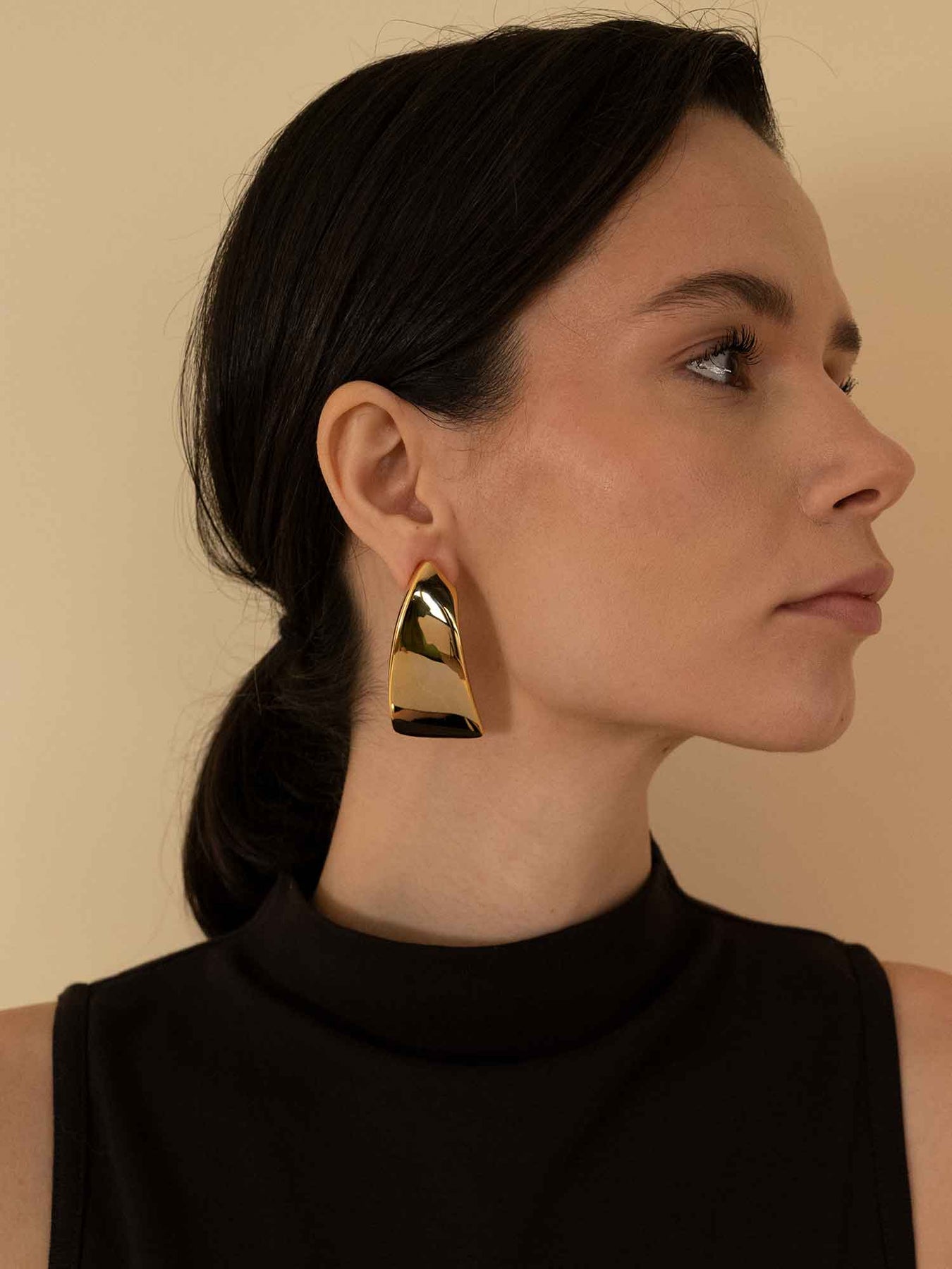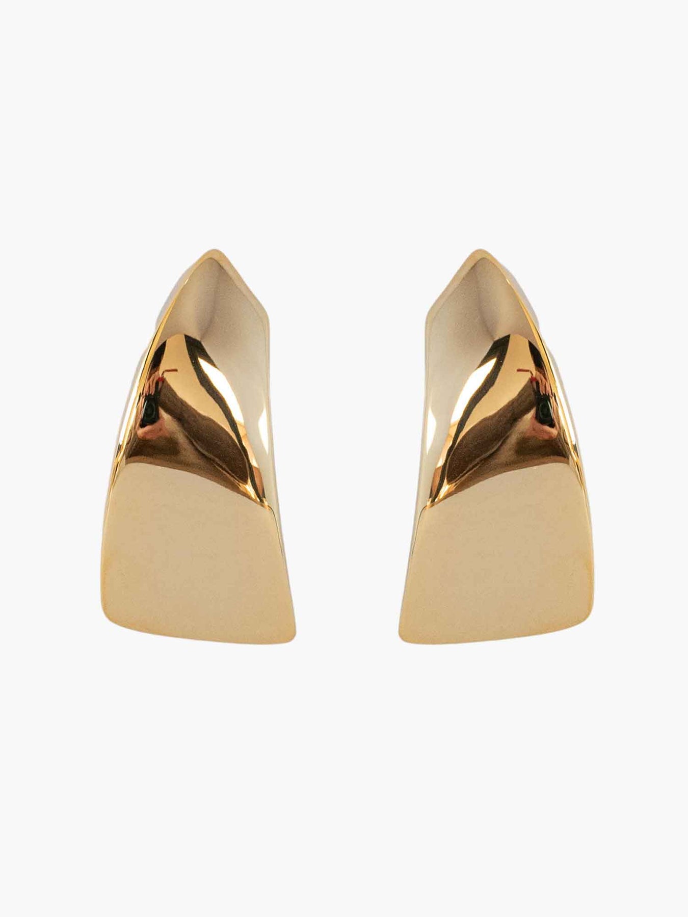 These earrings use a softly flared, sculptural wedge shape in polished gold, designed to catch light in broad, clean planes. The silhouette feels modern and intentional—bold enough to register, but without the extra detail that can make a piece feel seasonal.