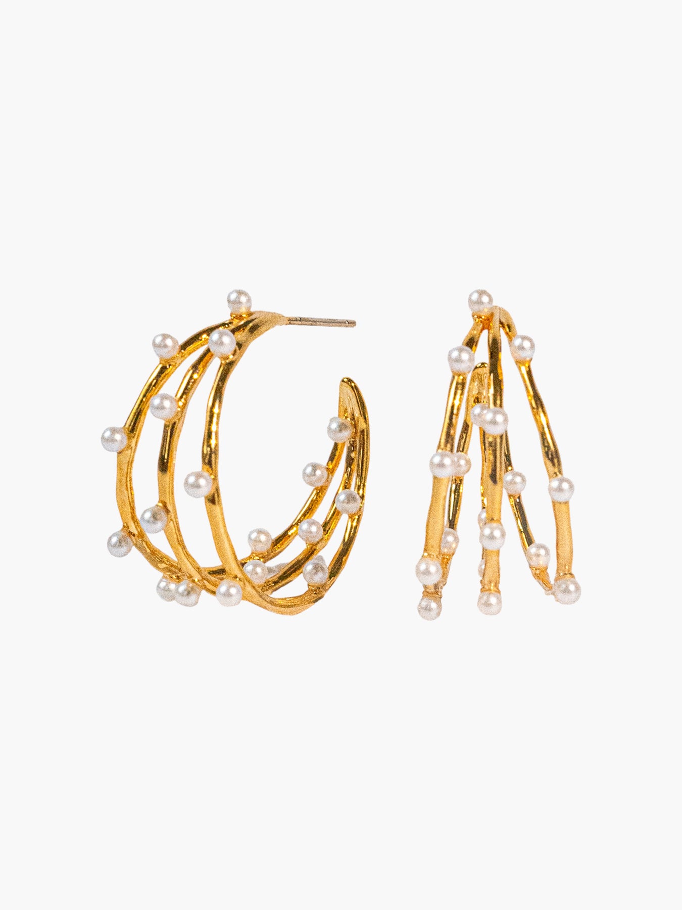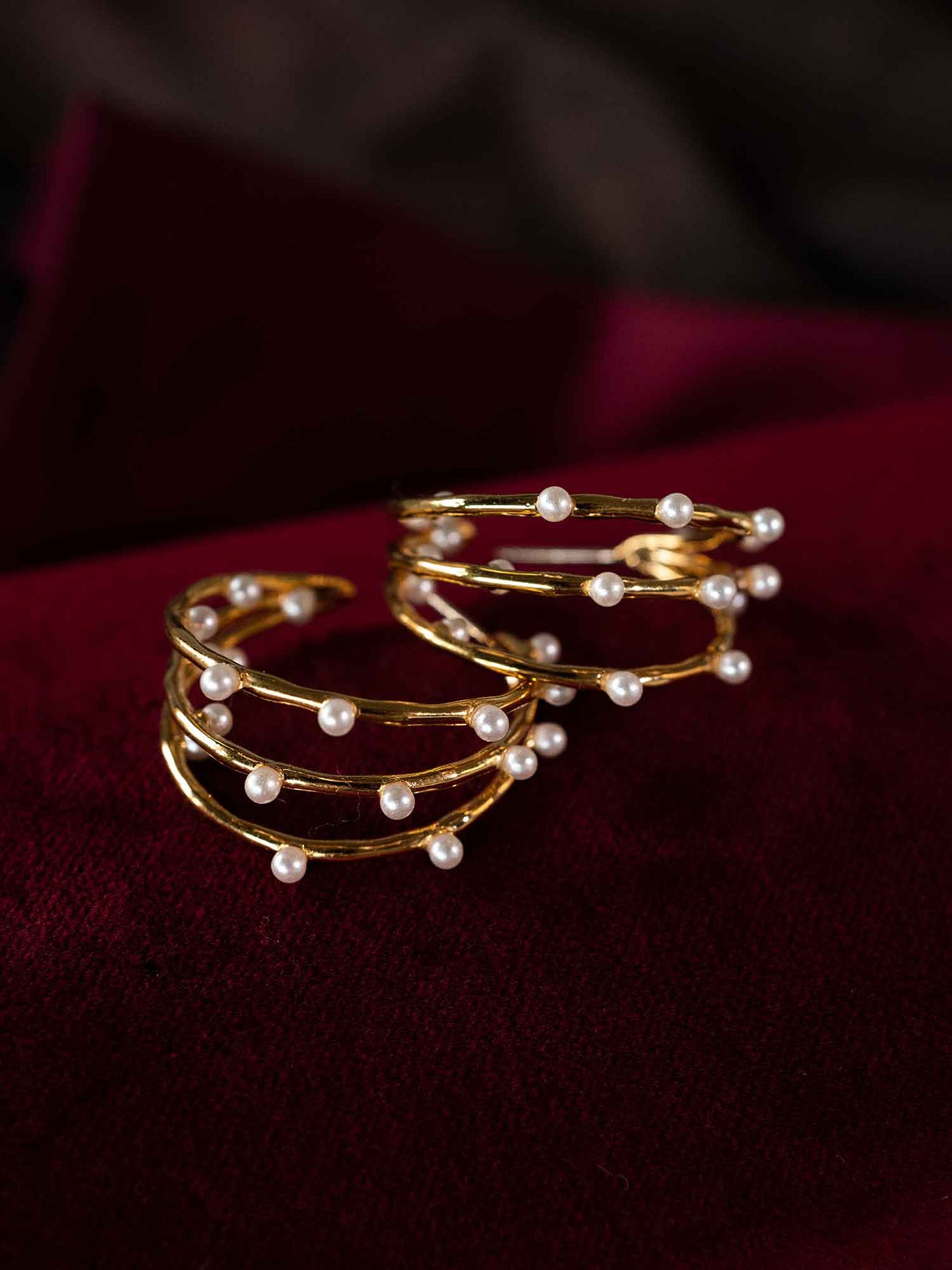 These hoop earrings feature multiple slim gold bands wrapped with small pearls spaced evenly for a light, layered effect. The open structure keeps them airy and mobile, with the pearls adding soft contrast against the polished gold.