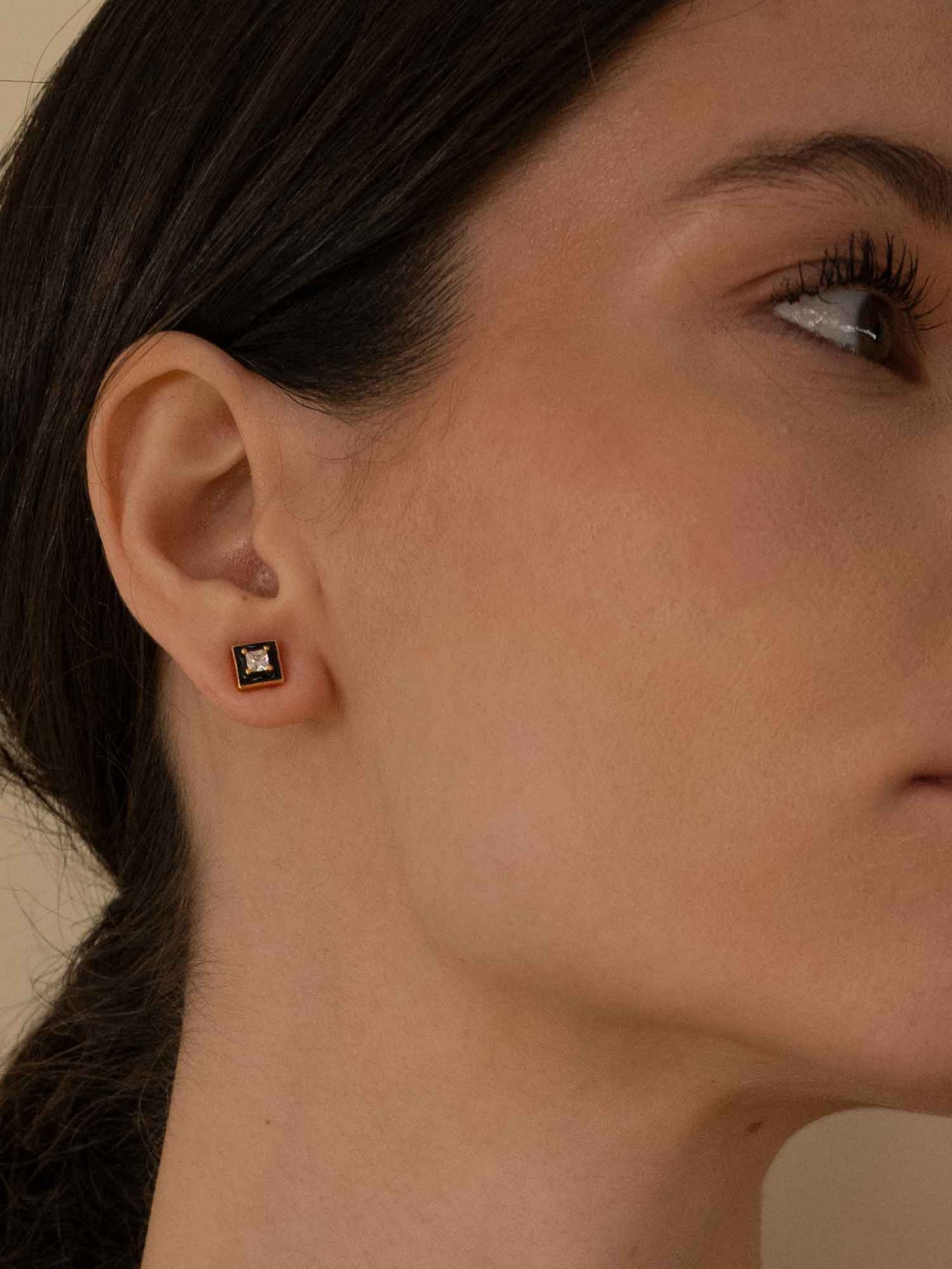 These stud earrings feature a clean square silhouette paired with deep black enamel, with a single square crystal at the center serving as the only highlight—restrained and precise. They sit close to the earlobe, virtually weightless, offering an almost imperceptible wear.