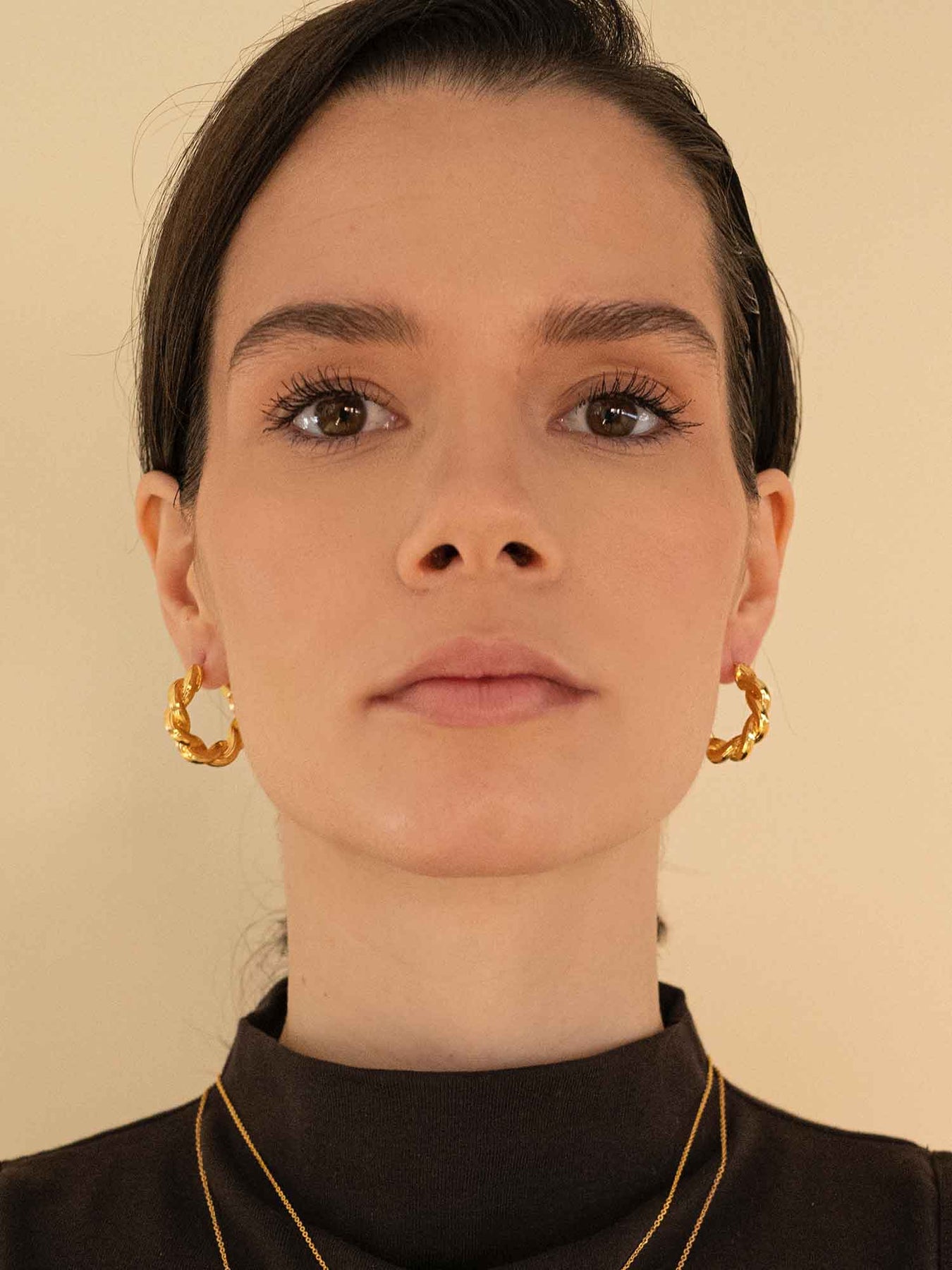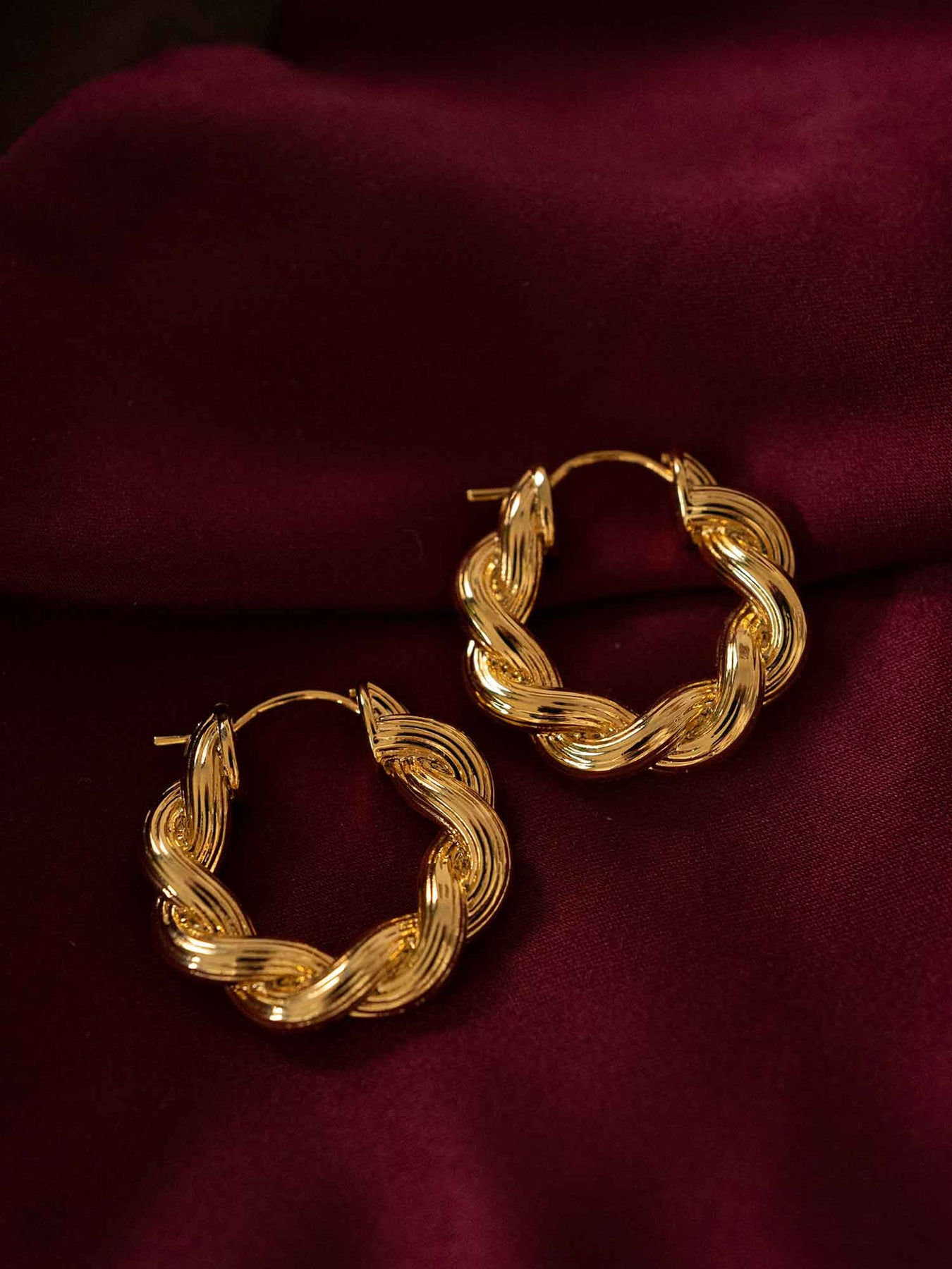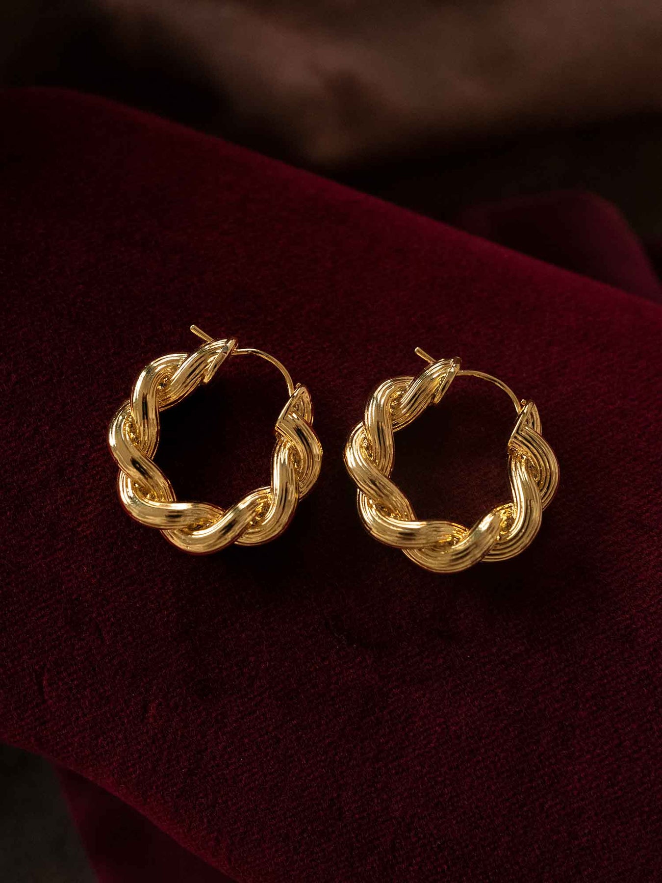 A compact hoop built from braided, ribbon-like links, finished in high-polish gold tone with pronounced ridging.