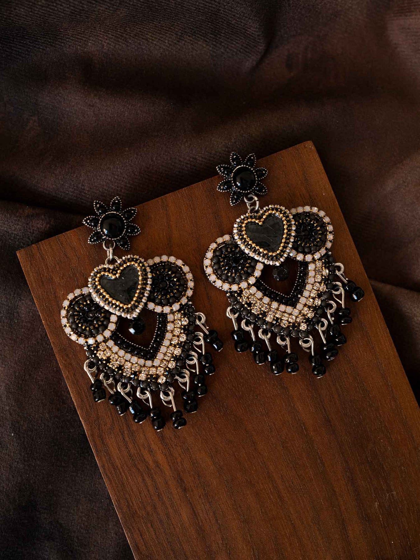 Allison is where bold drama meets intricate craftsmanship. These handcrafted earrings feature layered heart silhouettes and floral accents, meticulously assembled from glossy black and champagne-toned beads. The dangling drops add captivating movement, while the sculptural finish gives a touch of vintage romance with a modern pulse. Designed to turn heads, these earrings bring energy, attitude, and elegance—day or night.