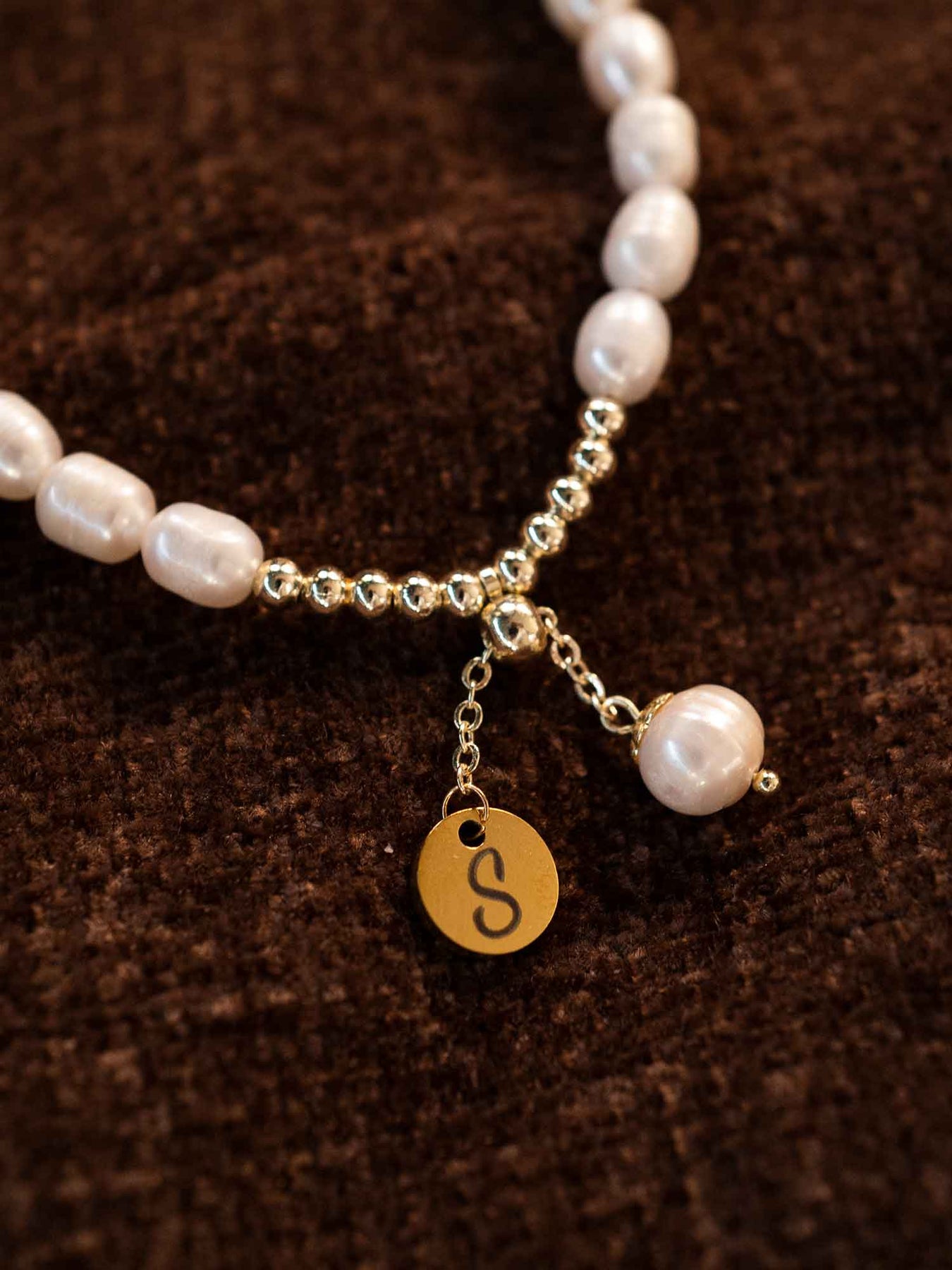 The combination of pearls in natural tones with light golden beads highlights the elegance and delicacy of the bracelet. The extension chain also showcases a delicate design with small cut-out hearts.