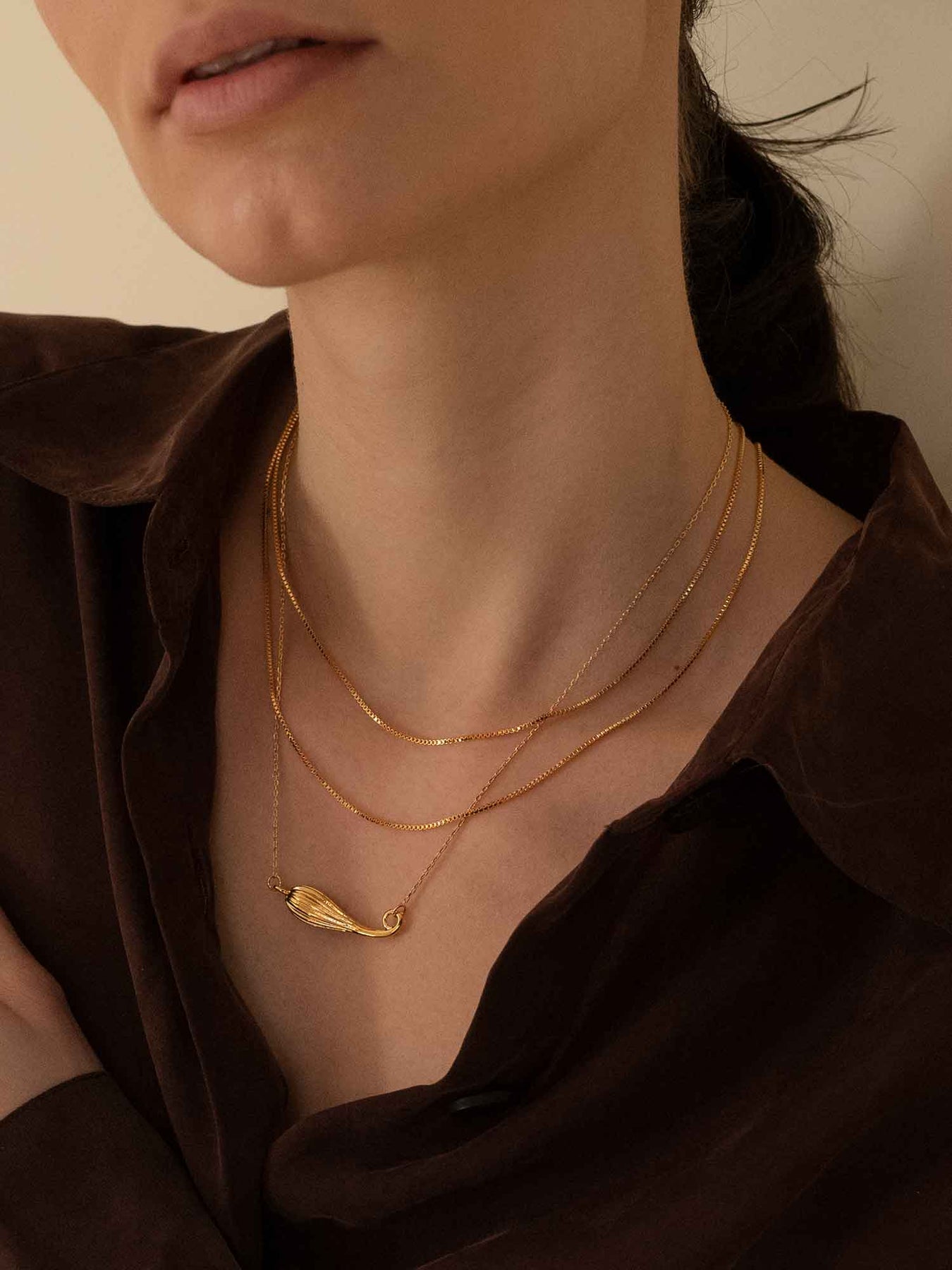 The pendant sits on a delicate chain that follows the neckline with ease. Worn alone, it creates a refined line; layered, it integrates smoothly with other pieces thanks to its balanced scale and understated detailing.