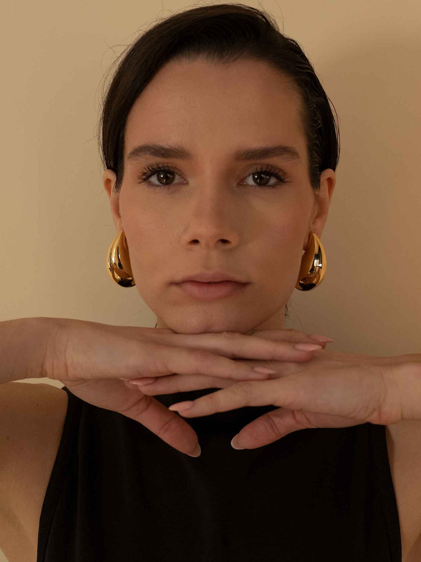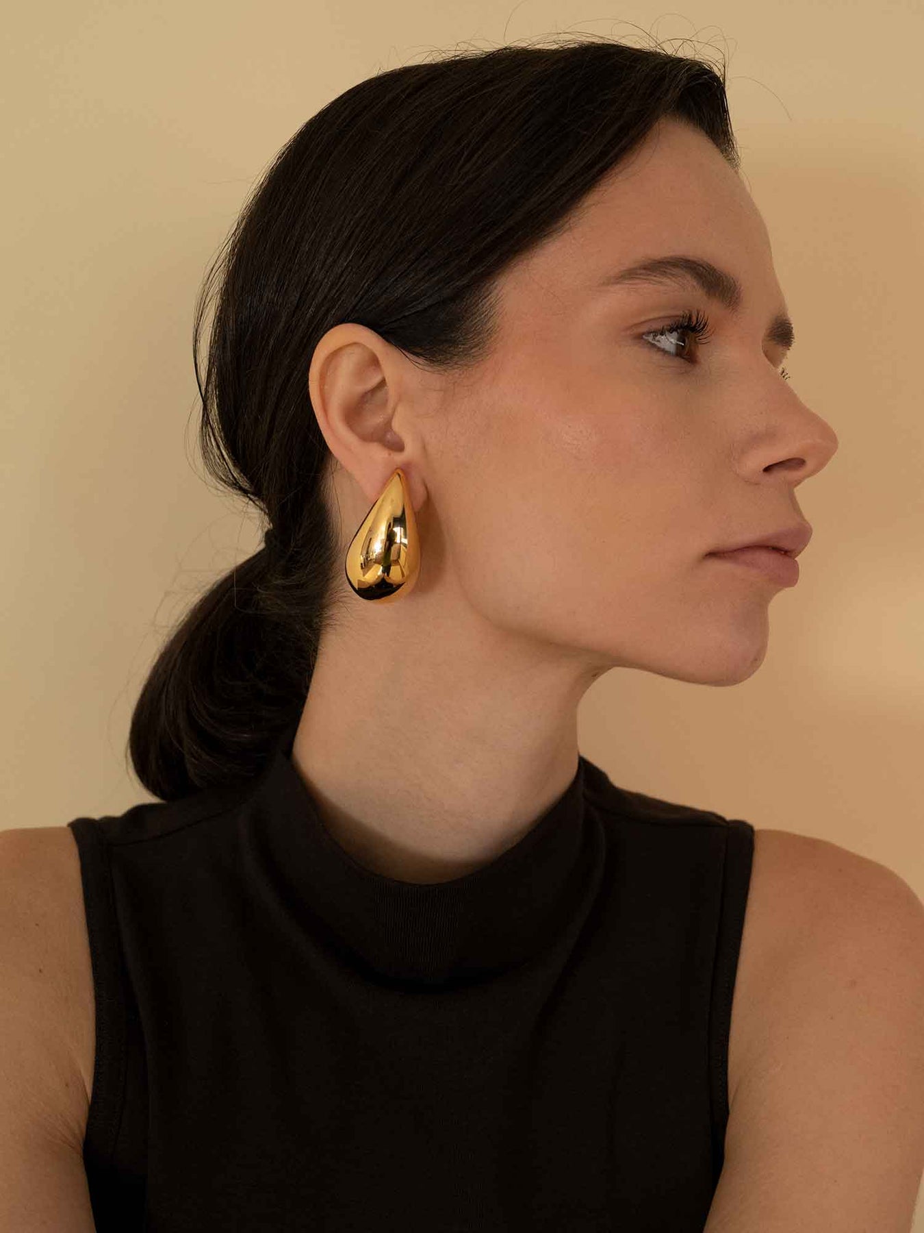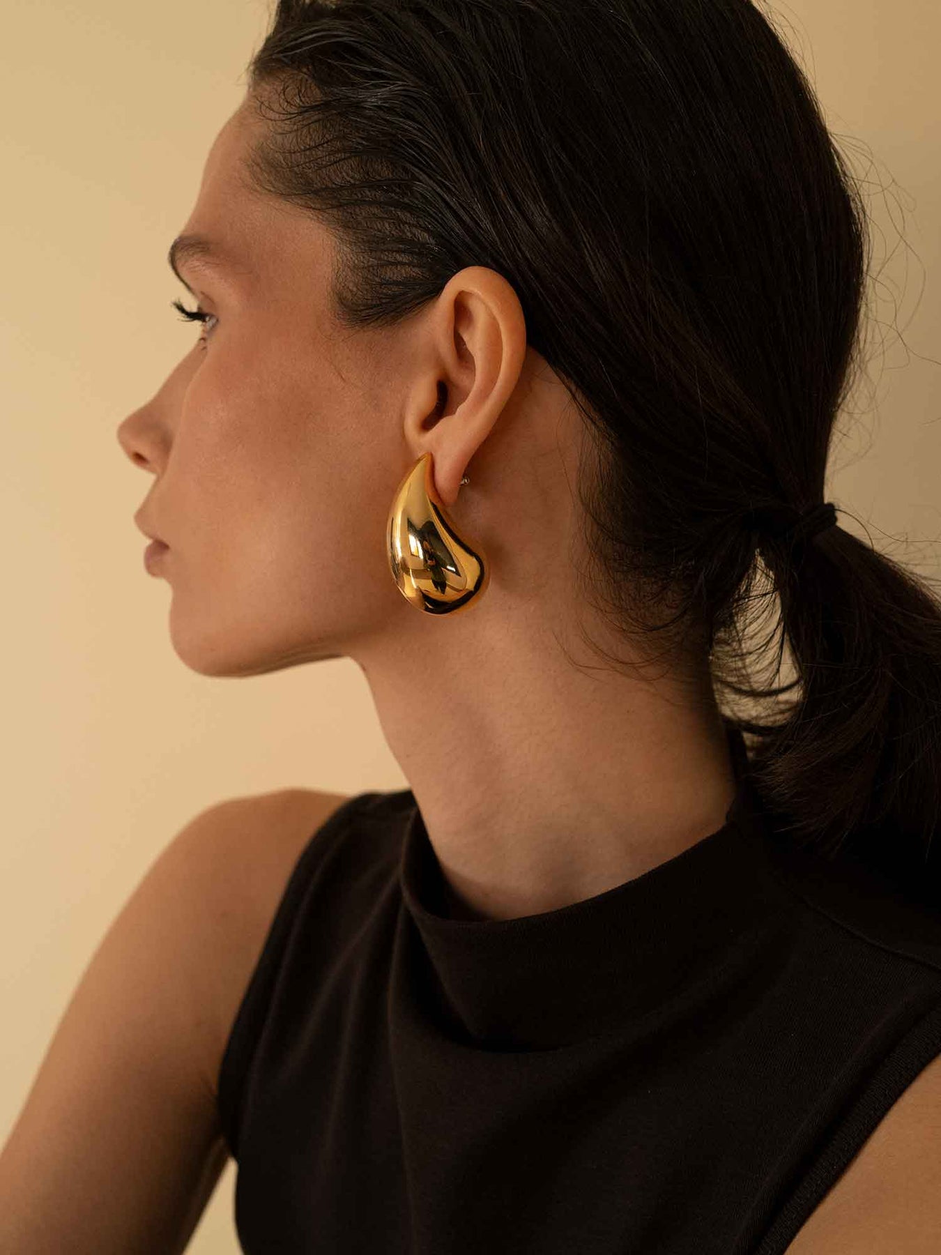 These earrings appear as if shaped from a droplet of molten gold, with smooth curves cascading along the earlobe, carrying a subtle sculptural flow.