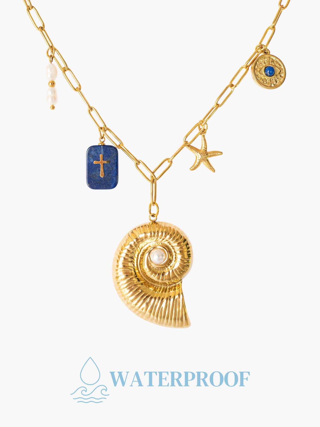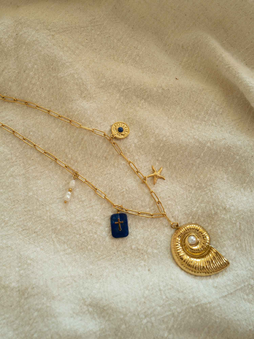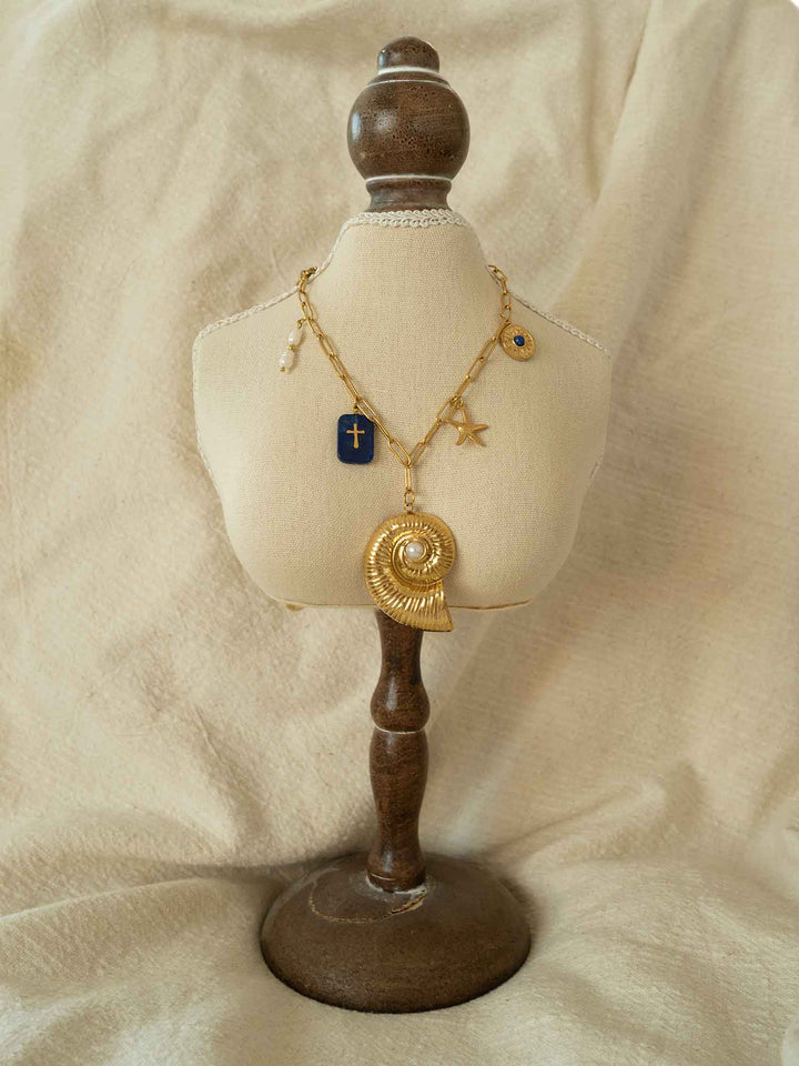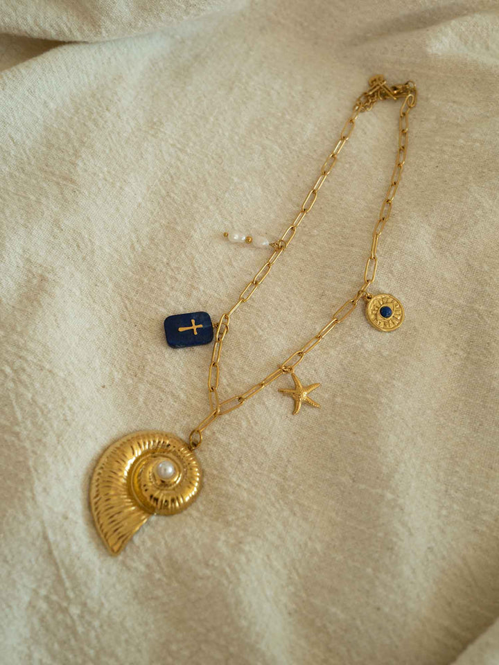 The Sirena necklace is a celebration of ocean treasures and talismanic charm. Featuring a bold spiral shell pendant adorned with a faux pearl, this waterproof stainless steel necklace also includes a mix of coastal-inspired details—lapis stone, pearls, a starfish, and coin charms—each adding a touch of mystique and meaning. Perfect for layering or wearing solo, it brings a story to every outfit.