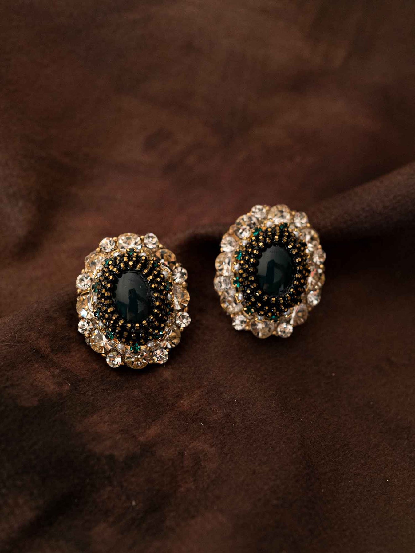Radiant with retro elegance, the Farrah earrings blend old-world glamour with statement sparkle. An emerald-green cabochon sits at the center, framed by intricate beading and shimmering crystal accents. The dimensional oval silhouette hugs the earlobe just right—bold enough to stand alone, yet timeless for any occasion. Pair with a silk blouse or your favorite black dress for instant sophistication.