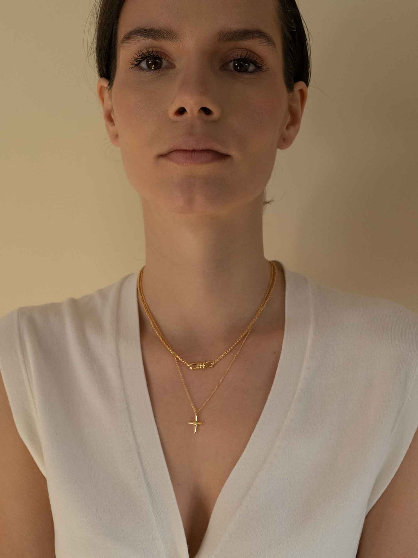 Este collar presenta una cruz fina y pulida formada por barras redondeadas, intersectadas en el centro por un fino detalle envolvente que aporta textura sin peso visual. La superficie es lisa y reflectante, realzando la claridad de la silueta en lugar de la ornamentación.
