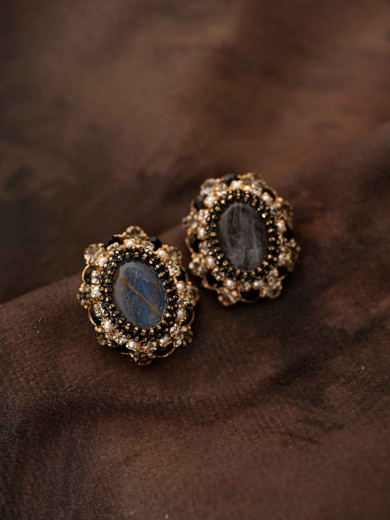 A delicate homage to vintage glamour, the Tasha earrings feature a smoky oval gem embraced by intricate antique-gold beading and shimmering stones. Their rich texture and muted tones evoke a quiet elegance, perfect for adding depth and dimension to your evening ensemble.