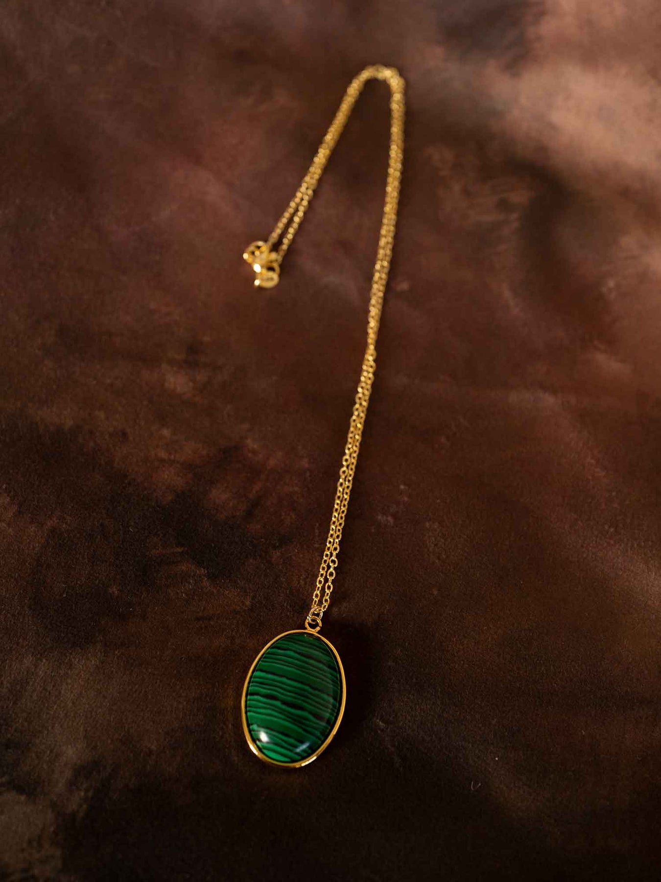 This Malachite pendant hangs delicately from a fine gold chain, showcasing its rich color and natural patterns with effortless elegance.