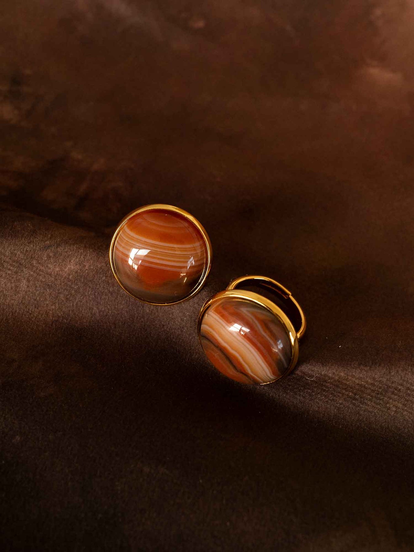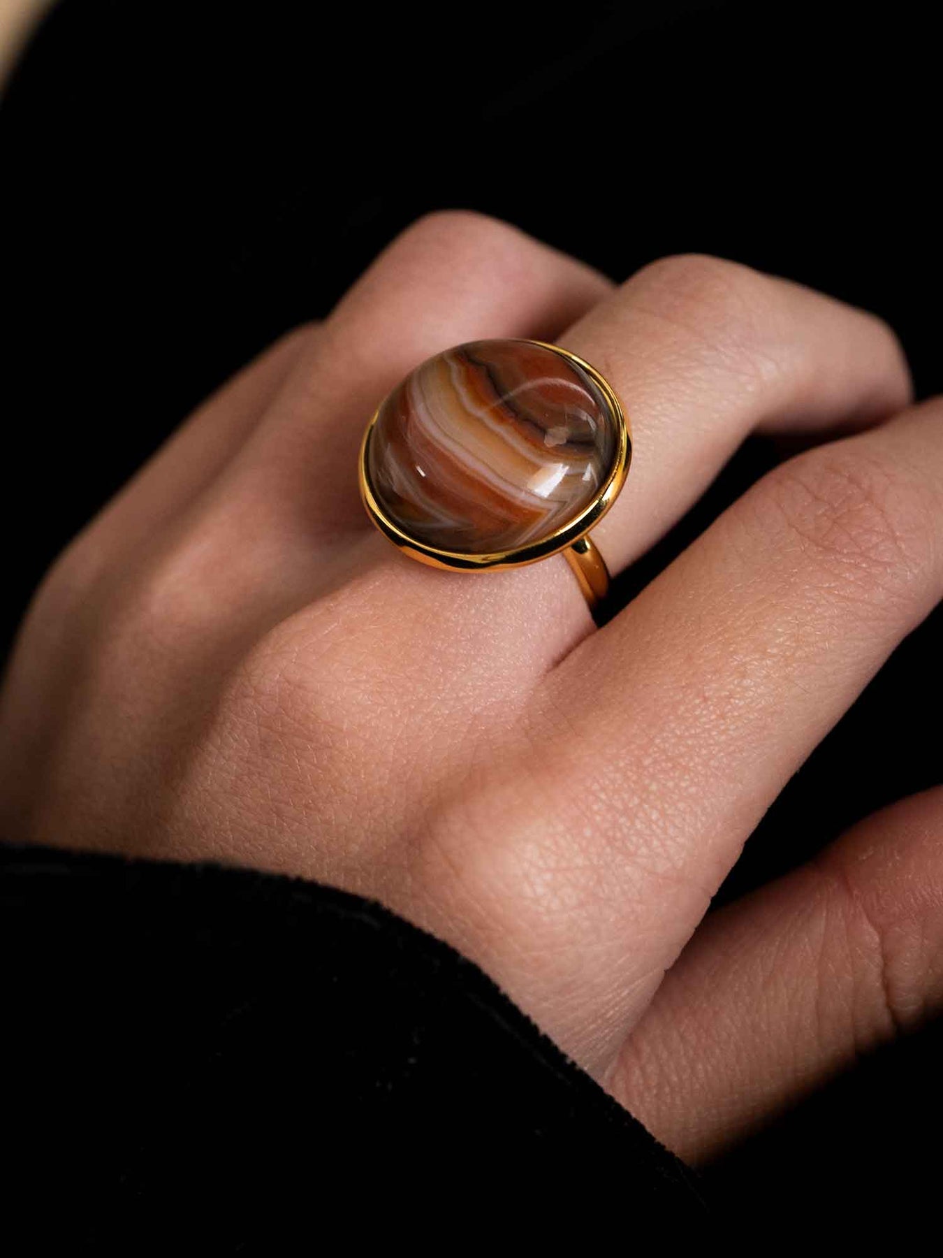 Hand-set in a gold band, the gently raised surface catches the light with a soft, mirror-like glow, making a striking statement while remaining effortlessly comfortable.