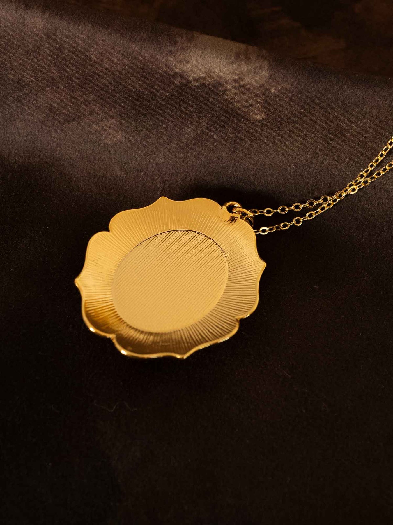 This warm gold embossed pendant features a deep burgundy stone that catches a subtle gleam in the light.