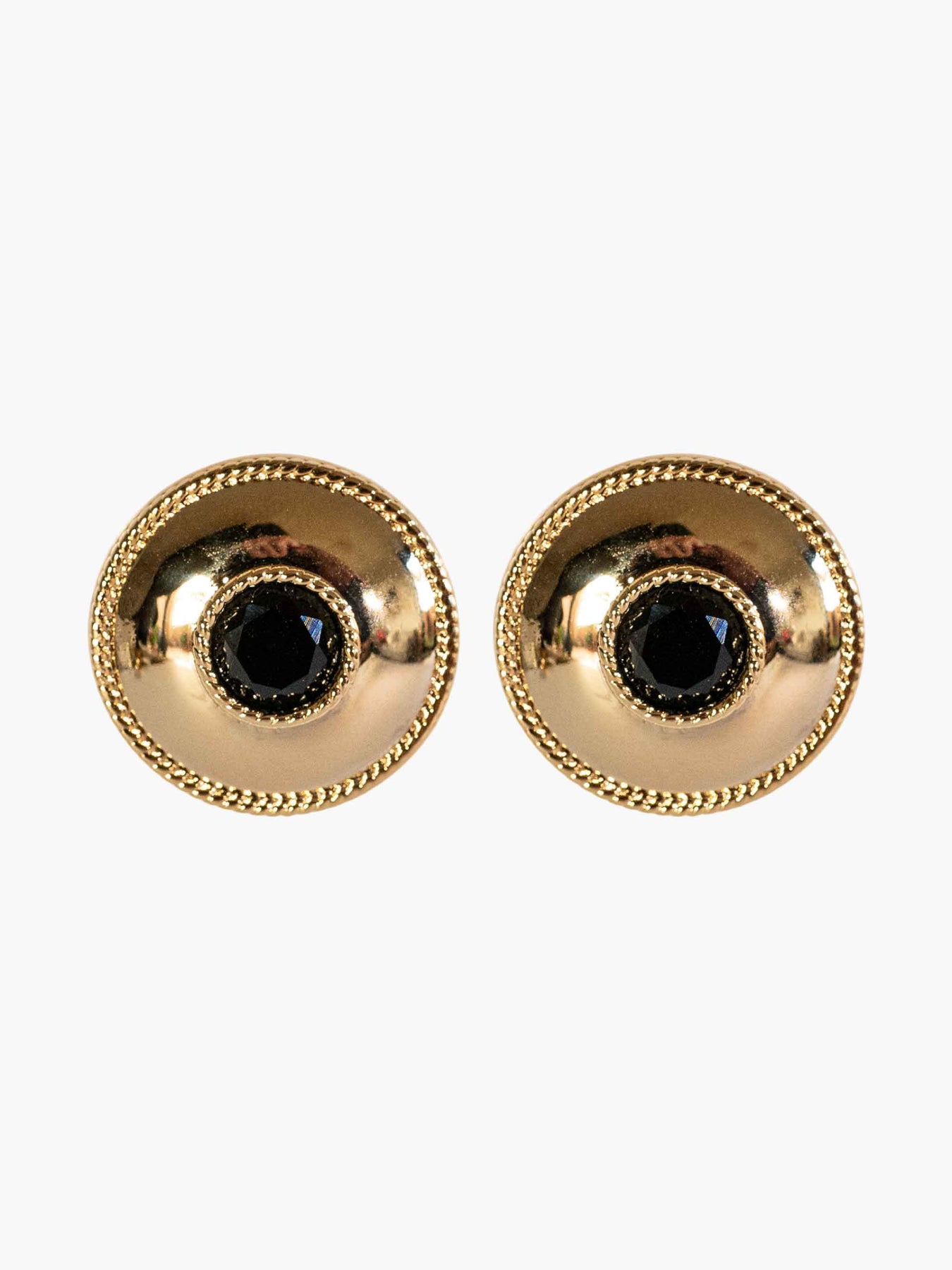 A gently domed gold disc catches the light in soft waves, while the inky center stone anchors the shine, giving the piece a quiet, confident focus.