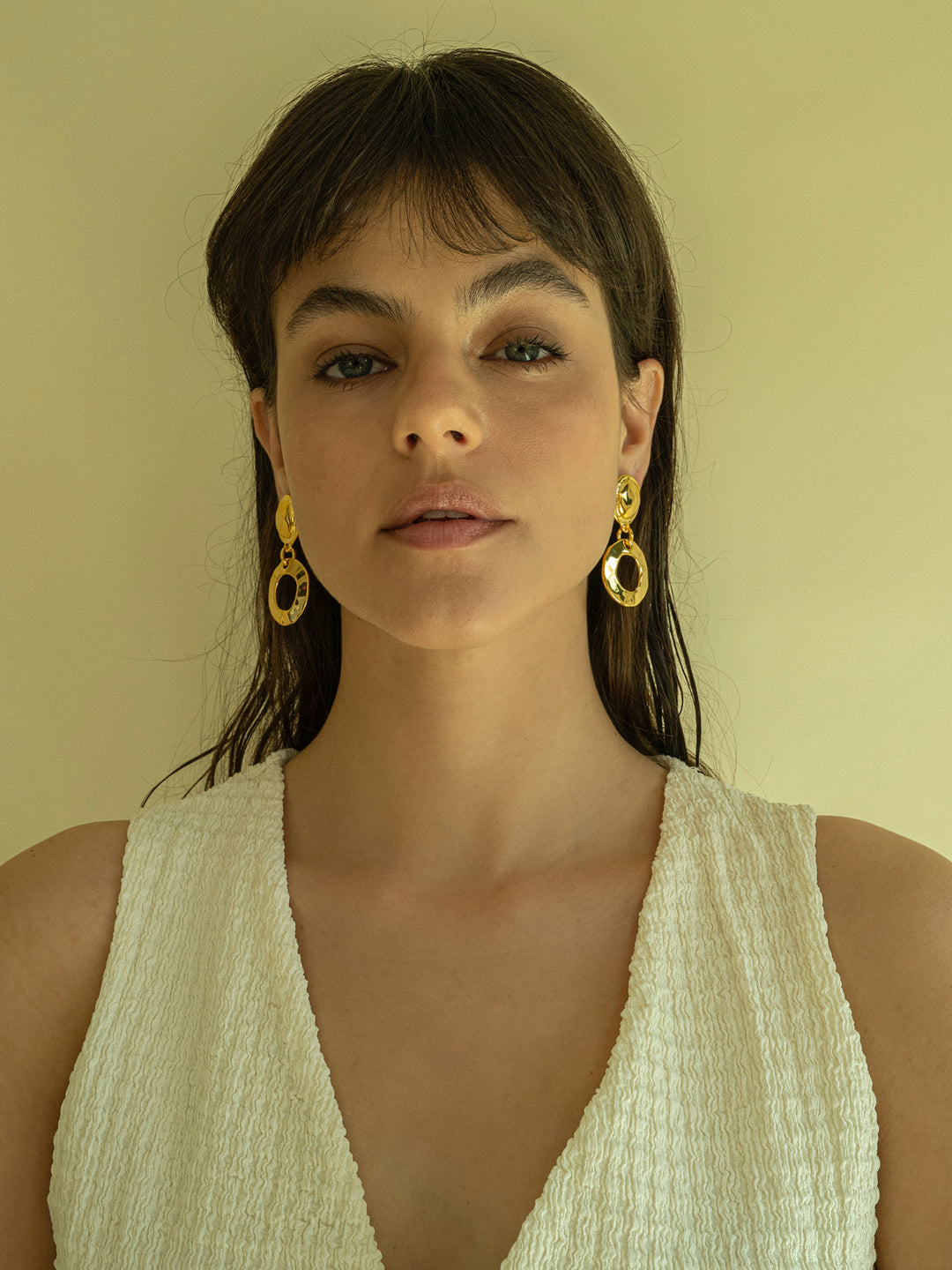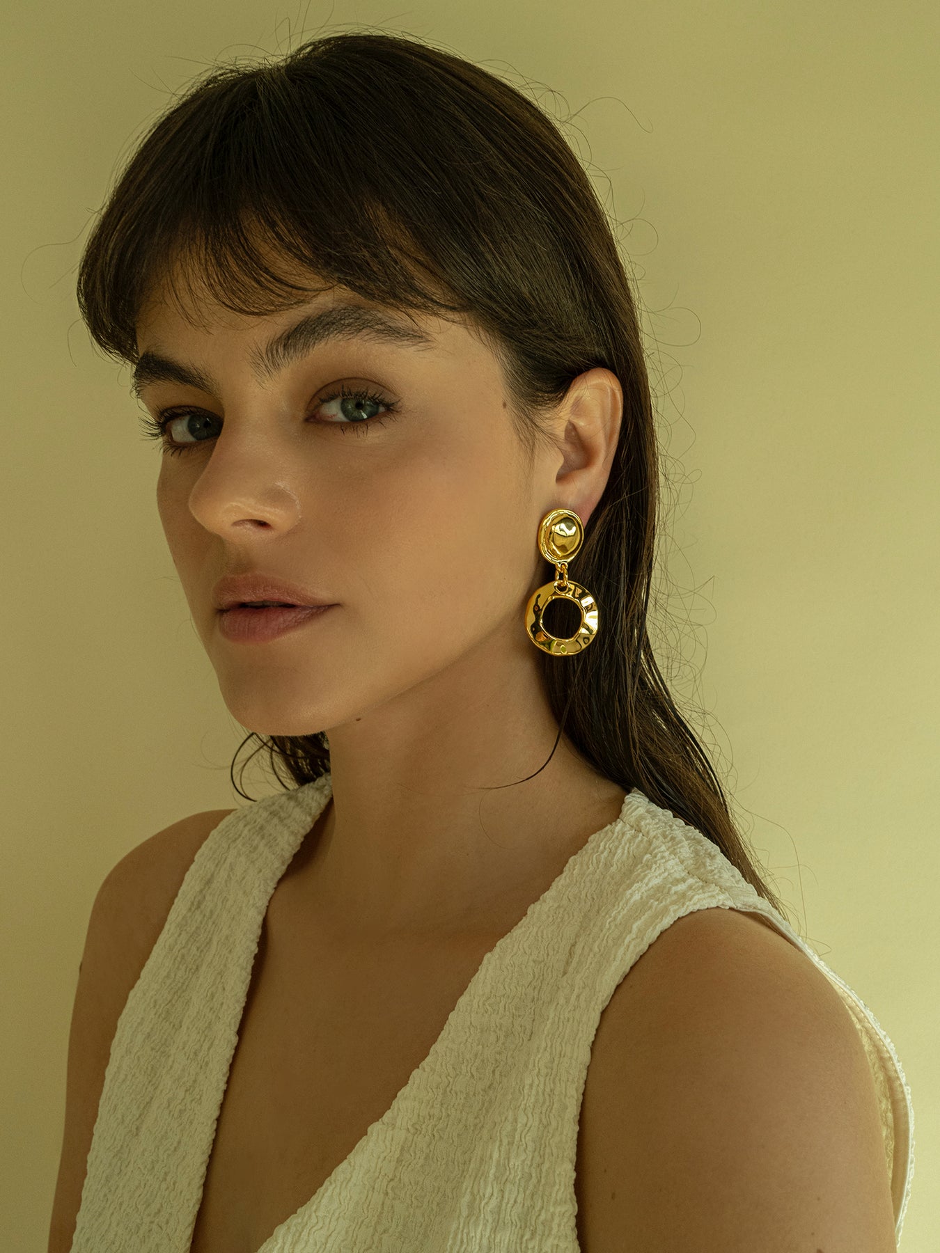 These earrings are not just accessories; they are bold statements of style and sophistication. Their innovative design merges the classic elegance of hoops with a modern, avant-garde touch. The shine of the gold captivatingly reflects light, drawing all eyes towards you. With every sway, they convey a sense of confidence and power.