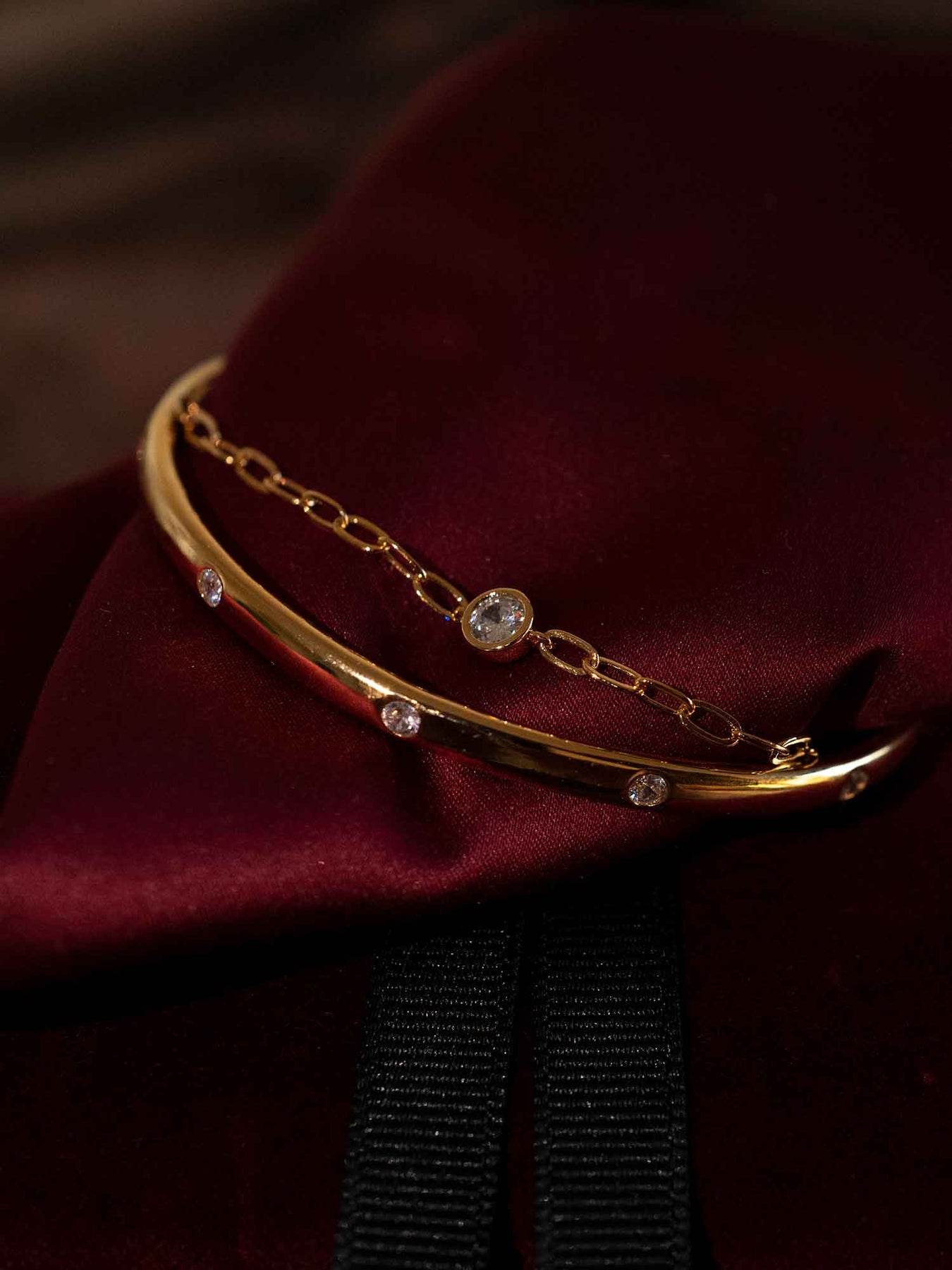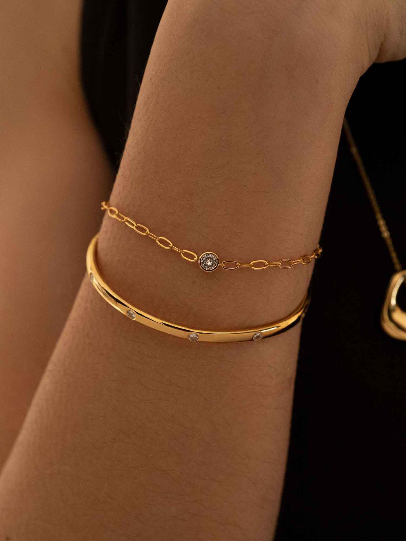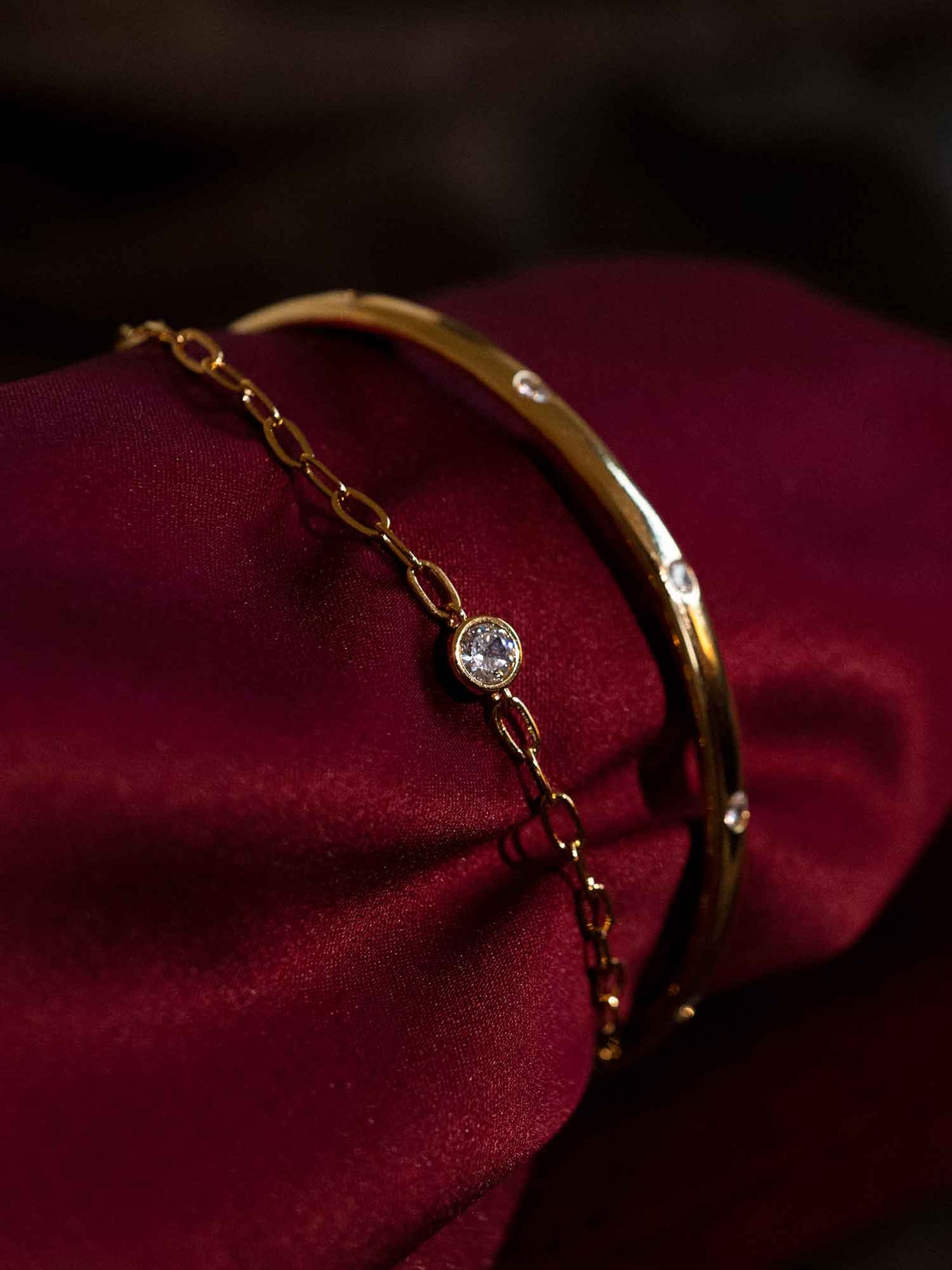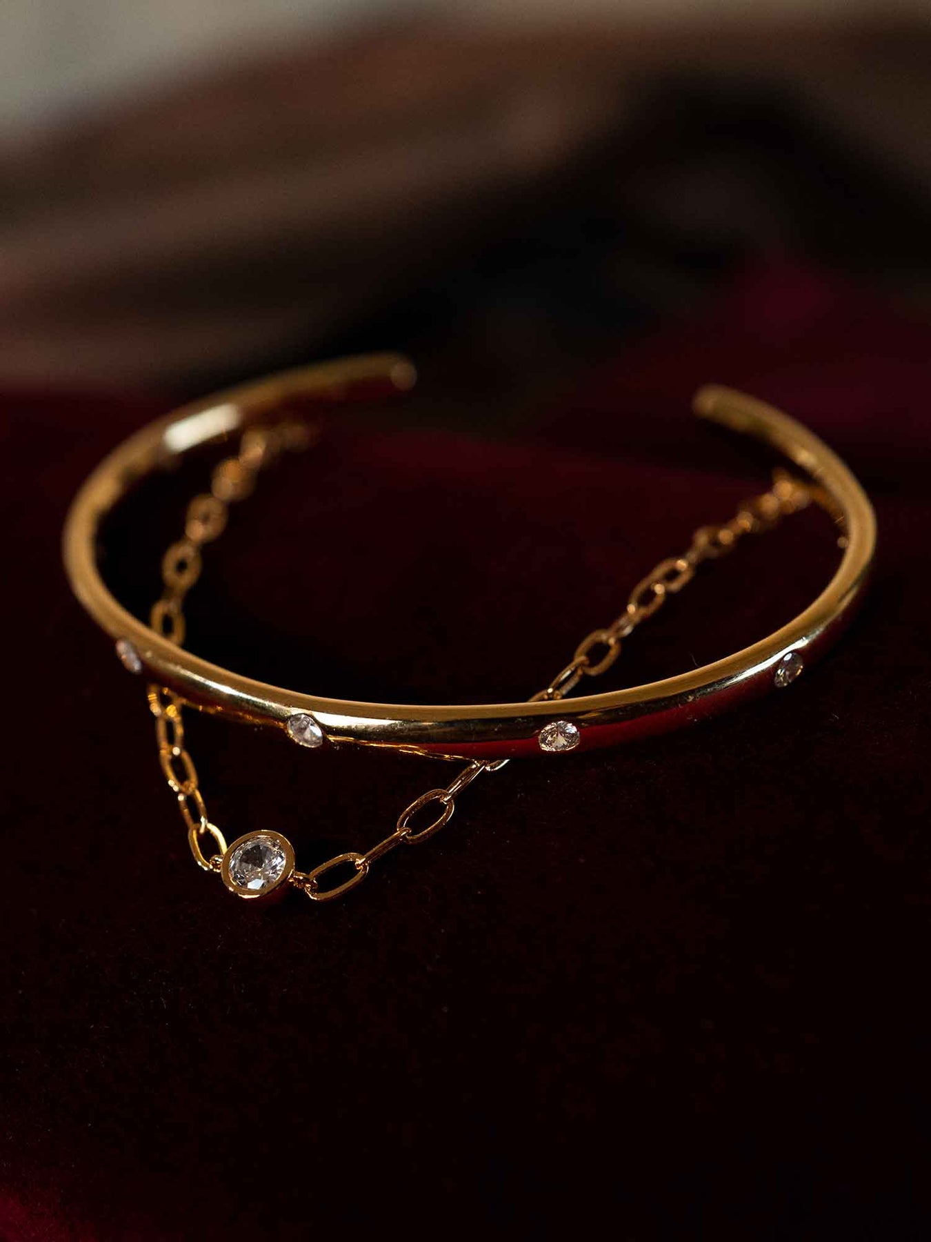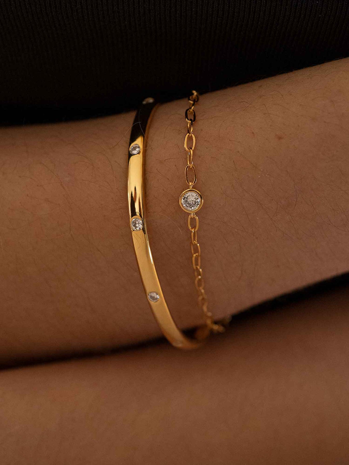 A slim gold bangle is punctuated with small bezel-set stones, paired with a fine chain that adds a second, lighter line across the wrist. The contrast between the clean cuff and the delicate chain feels intentional and modern, with sparkle kept subtle and evenly spaced.