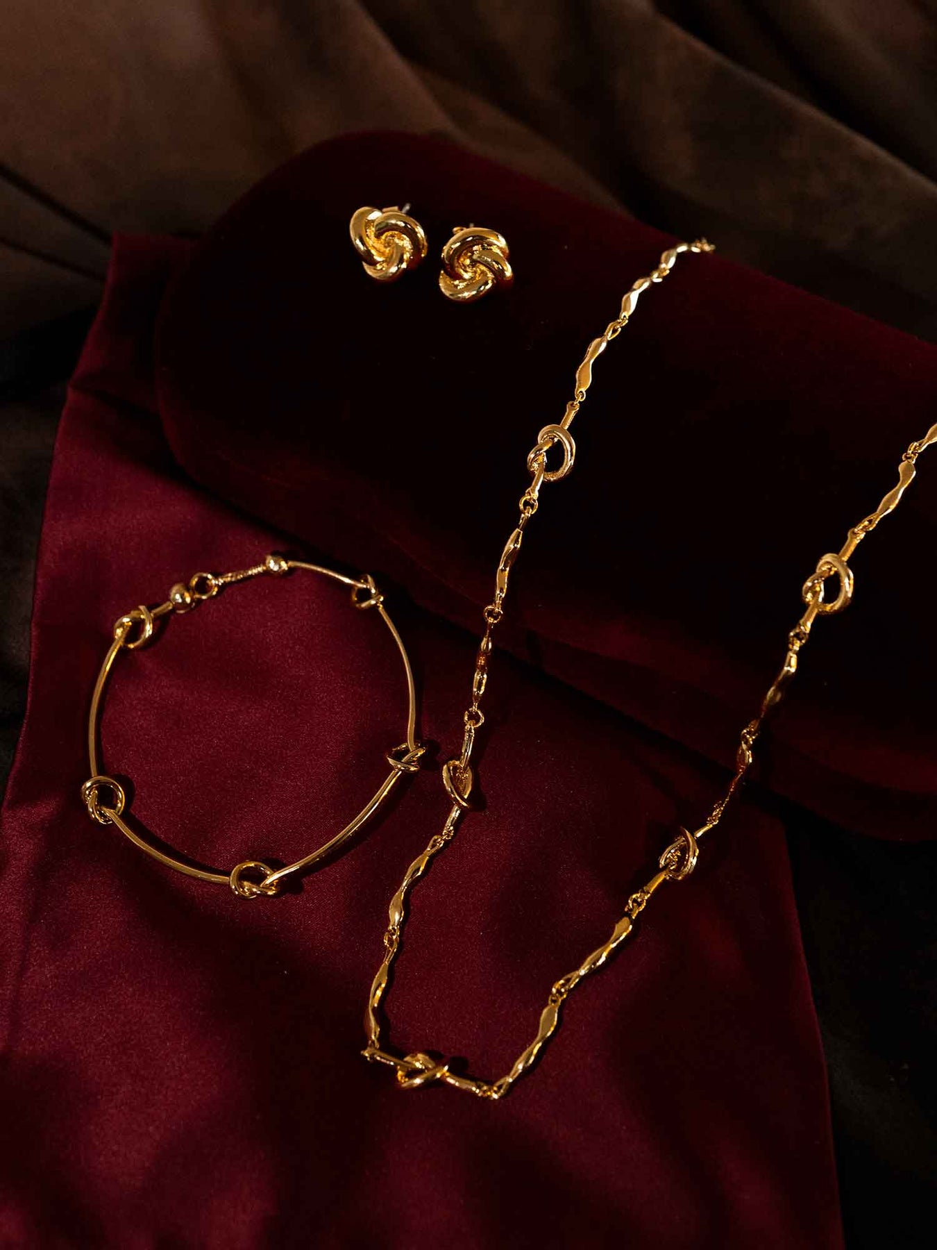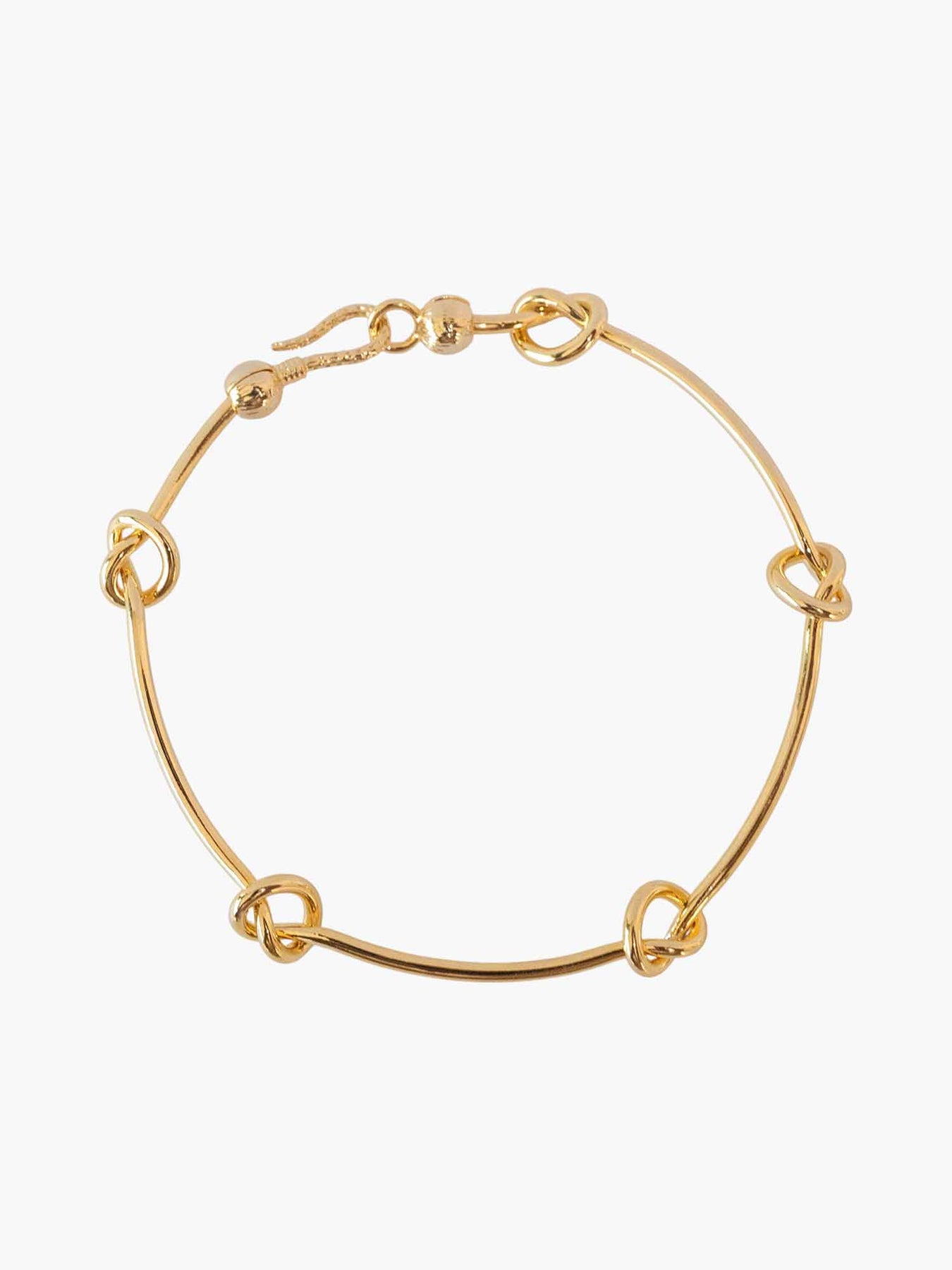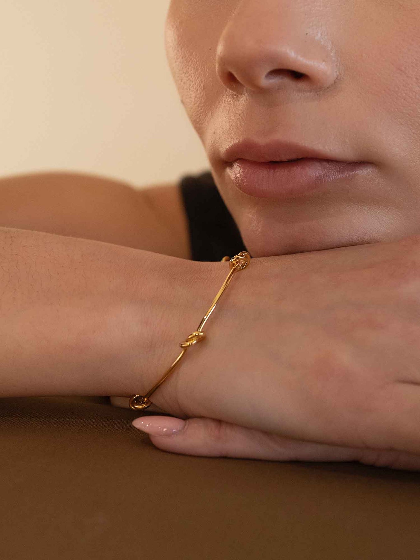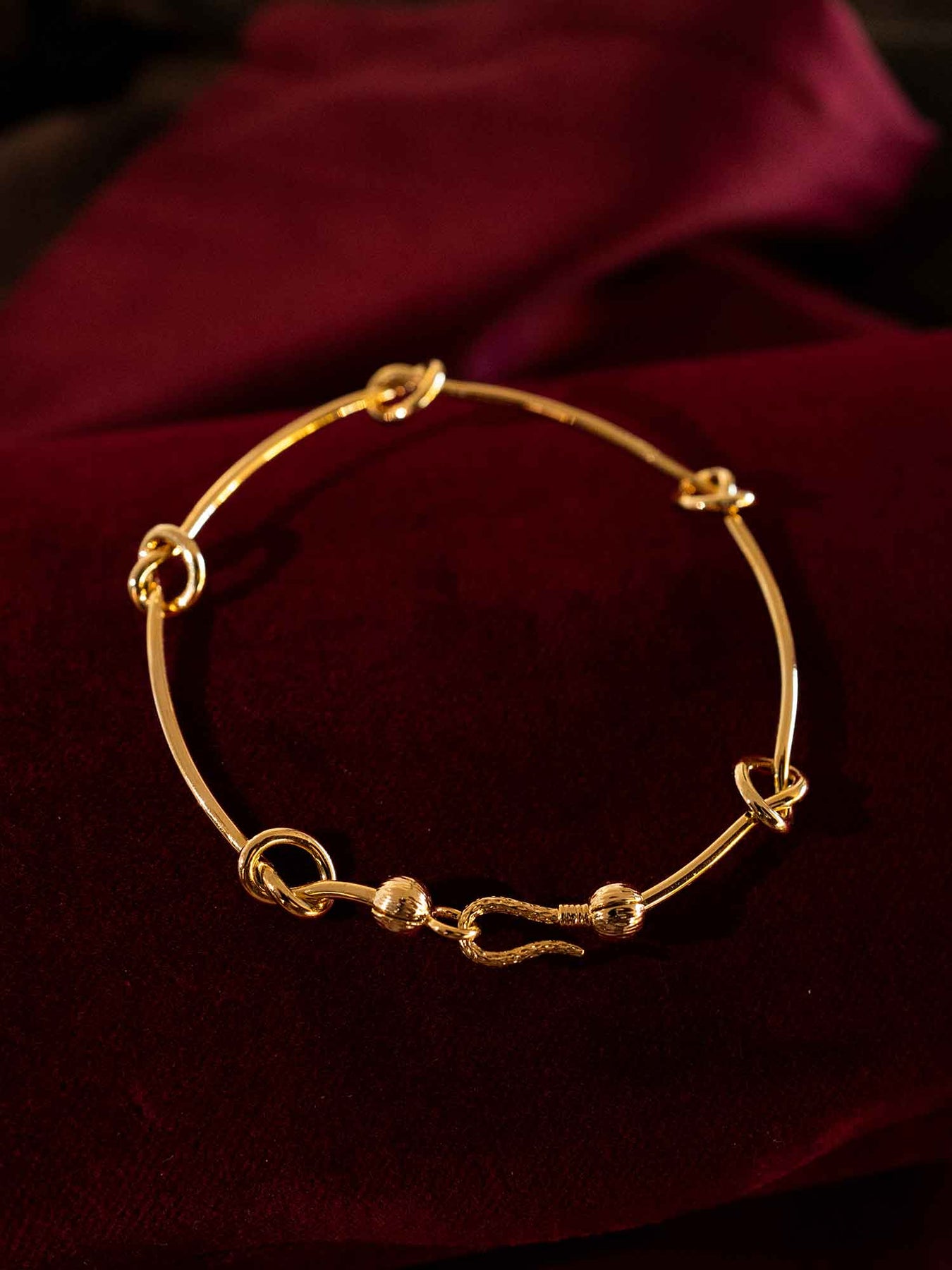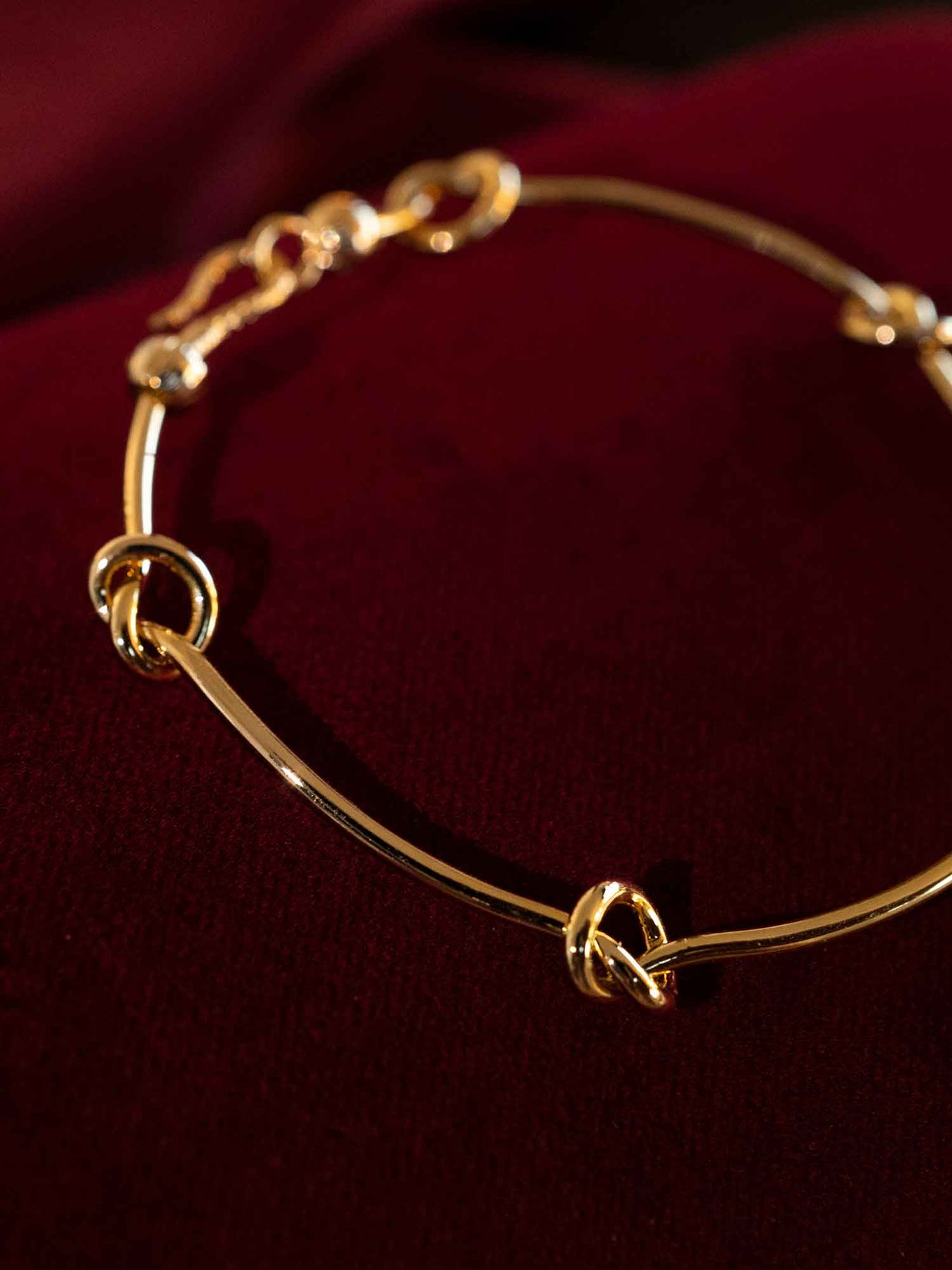 A slim gold bangle is punctuated with small knot-like links, giving the clean circle a quiet sense of structure. The line stays light and minimal, with just enough detail to feel intentional rather than plain.