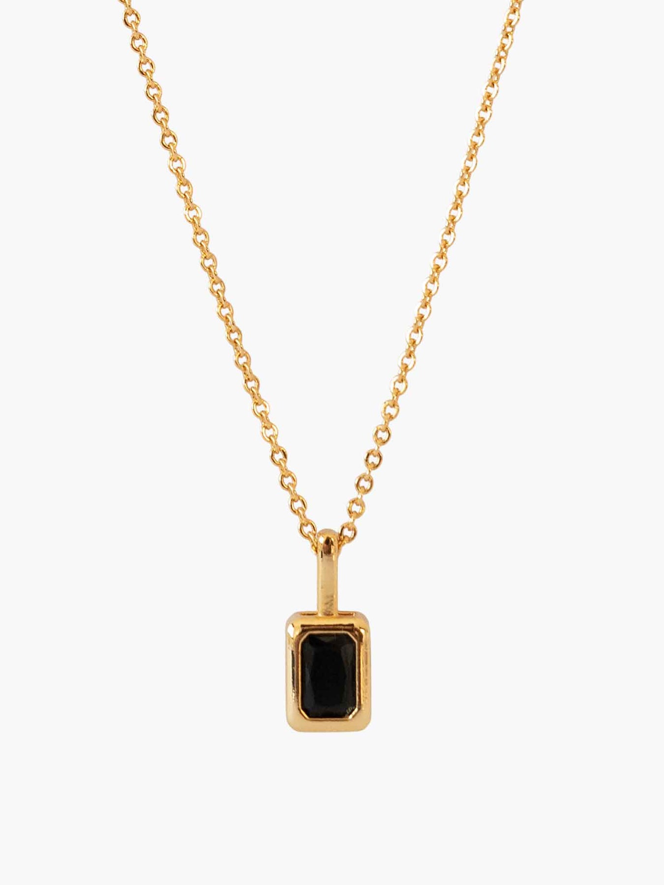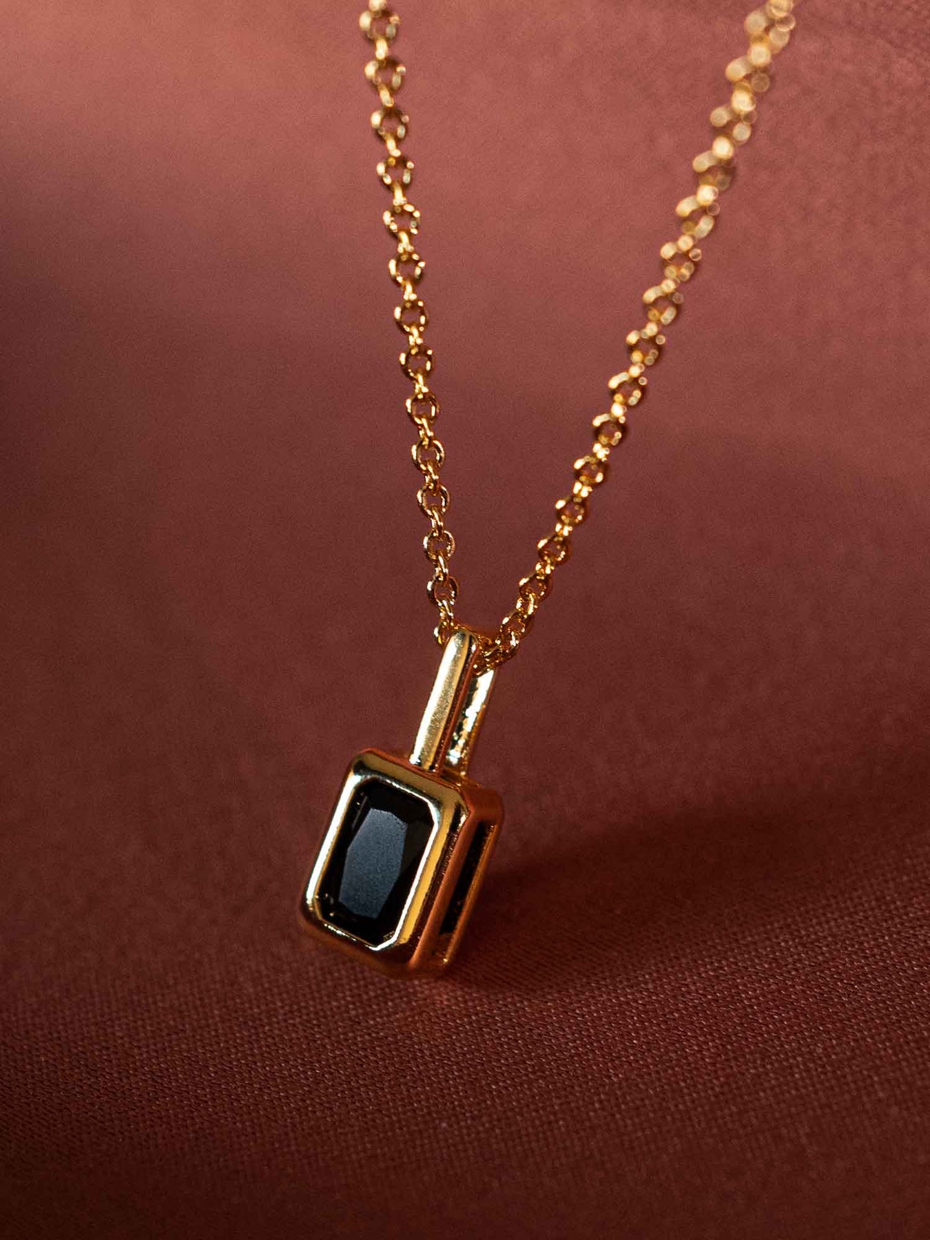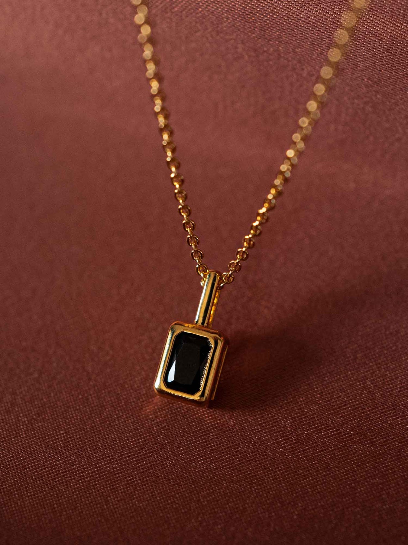 A small rectangular black stone sits in a slim gold frame, suspended from a fine chain for a crisp, graphic finish. The pendant stays close to the body and reads clean at a glance—lightweight, easy to wear.