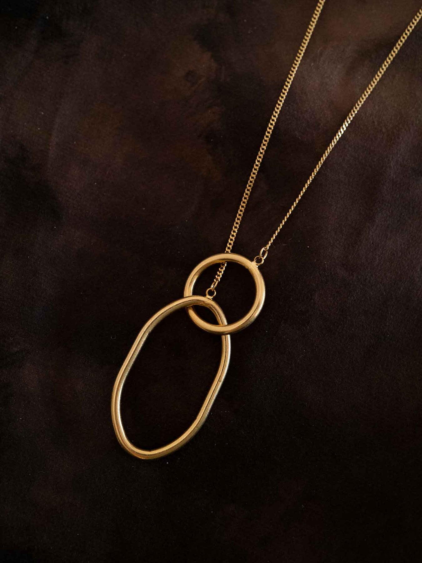 Bold yet refined, the Kalysta Necklace showcases a dynamic duo of interlocking circles, adding a modern touch to your everyday look. The contrasting shapes create a fluid design, with a larger organic oval paired elegantly with a polished circle. Whether worn solo or layered, this necklace brings an effortless statement to any outfit.