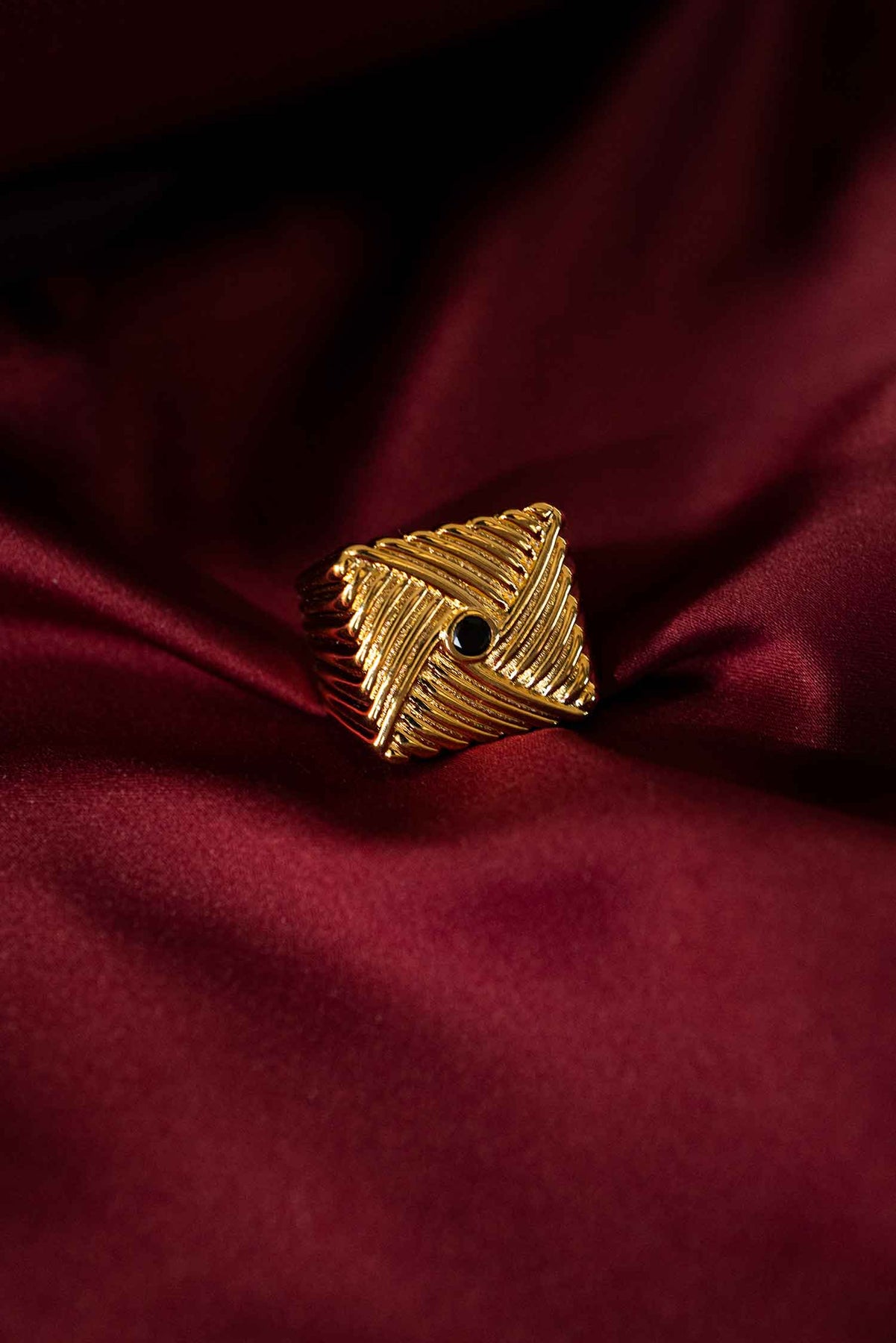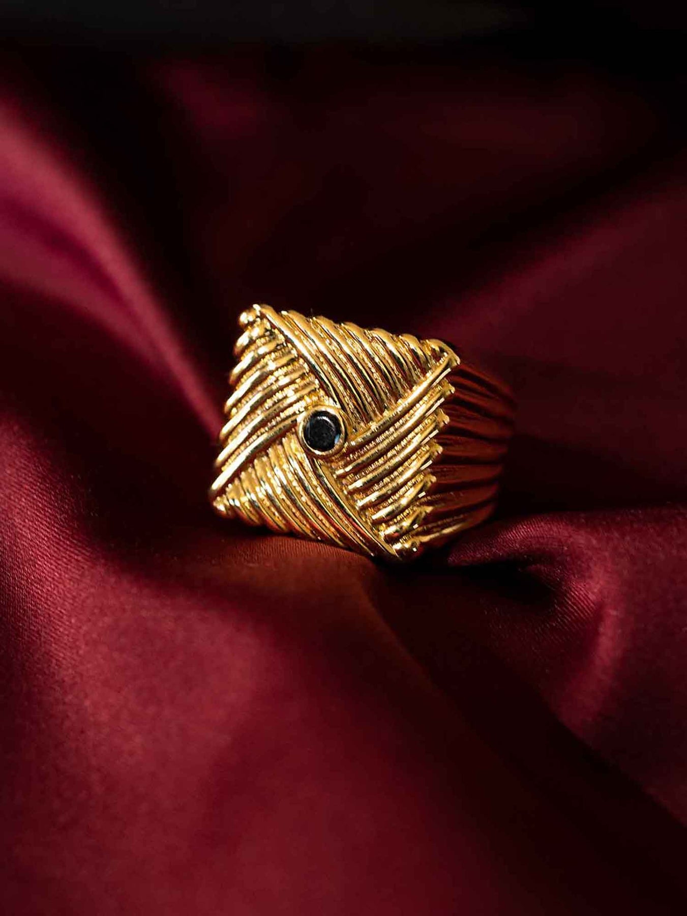 Fine, ribbed bands wrap diagonally around the finger to form a compact square, with a small dark stone set at the center as a quiet anchor. The volume is measured, giving presence without feeling cumbersome in daily wear.